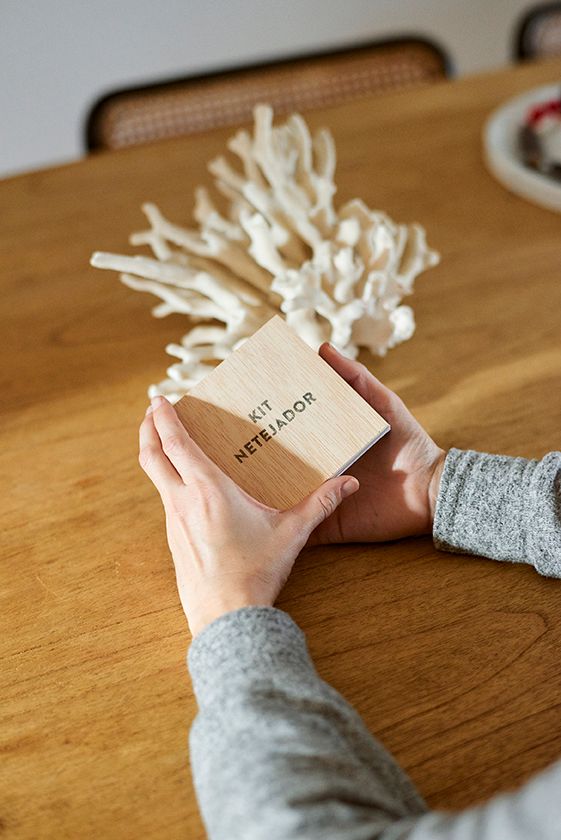 El librito hace de base para poder usar la técnica de envolver Furoshiki. Las maderas son reutilizadas de los sobrantes de otros proyectos y para la encuadernación se aprovecha la merma que genera para hacer las etiquetas del cierre del pack.