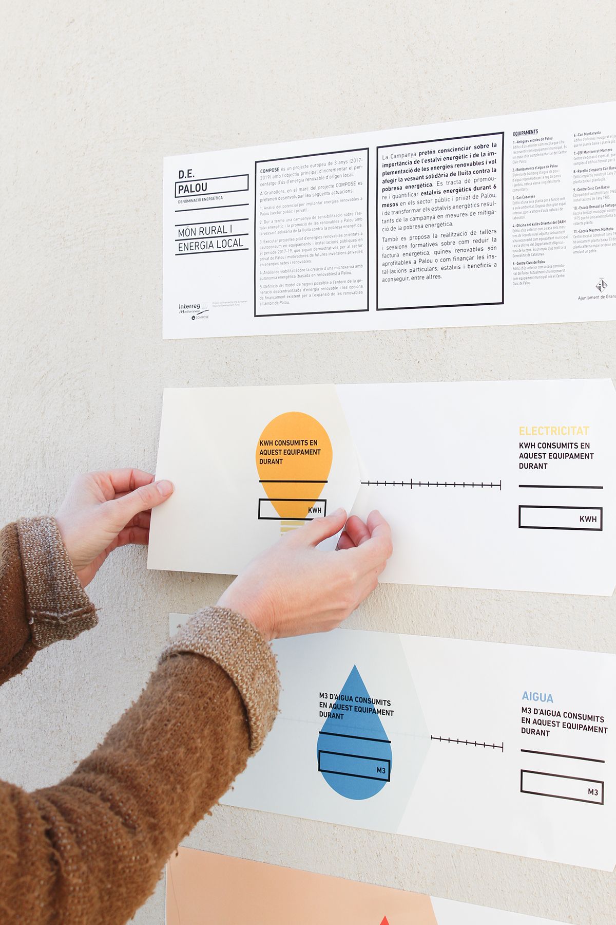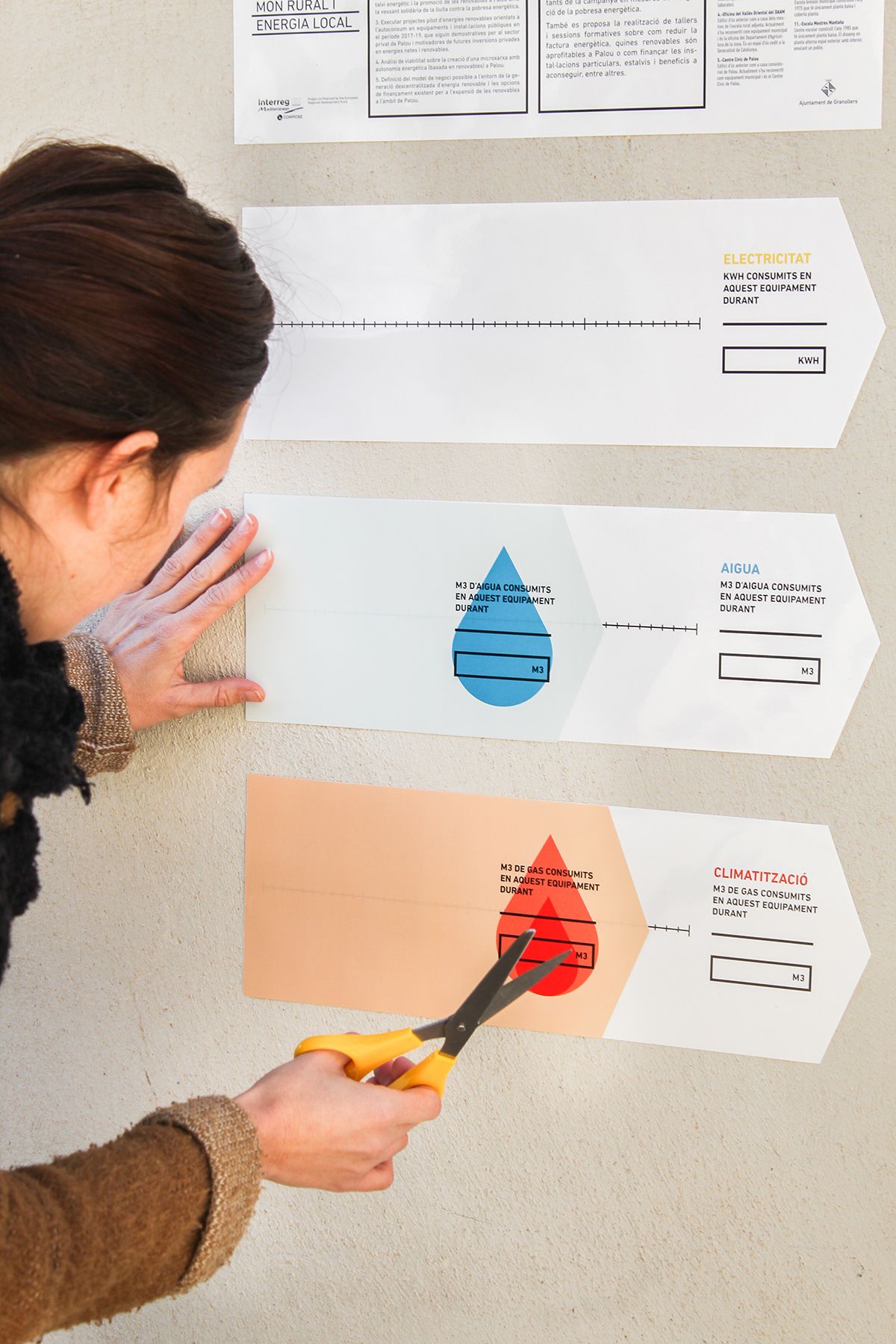 También realizamos unos indicadores de gran formato, los cuales informaban haciendo una comparación con el mes anterior del consumo de agua, gas i electricidad (cada uno con su color y pictograma respectivo).