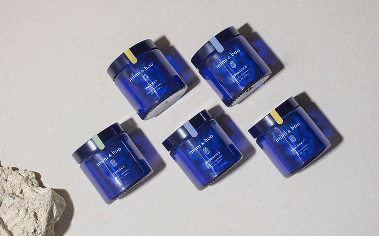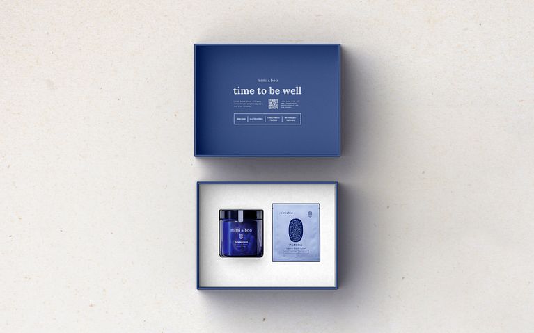 We thought about Mimi & Boo as an elegant and relaxed concept. A chilled and restful house on the Mediterranean sea which brings us good memories. With these ideas in mind we decided to use a blue glass jar for the initial product purchase and, for the refill sachets, colours based on the sun, the sky and the sand.