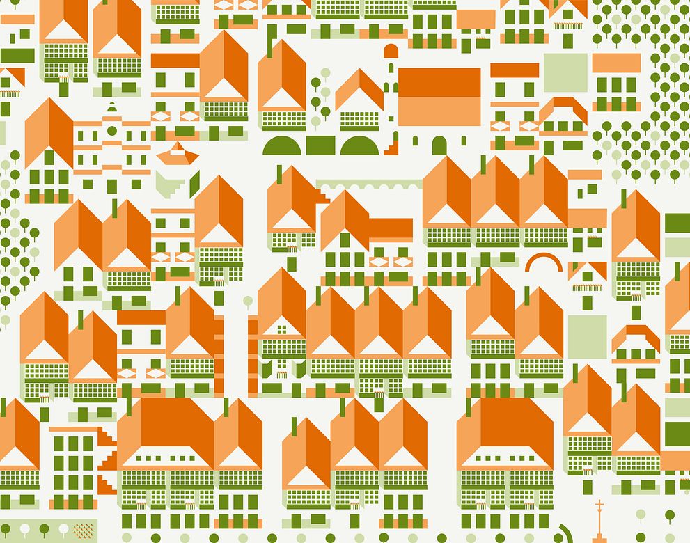 Una vista sintética de un pequeño pueblo pesquero. Utilizando un número limitado de colores y de elemetos el reto es conseguir una ilustración expresiva y fiel a la realidad.