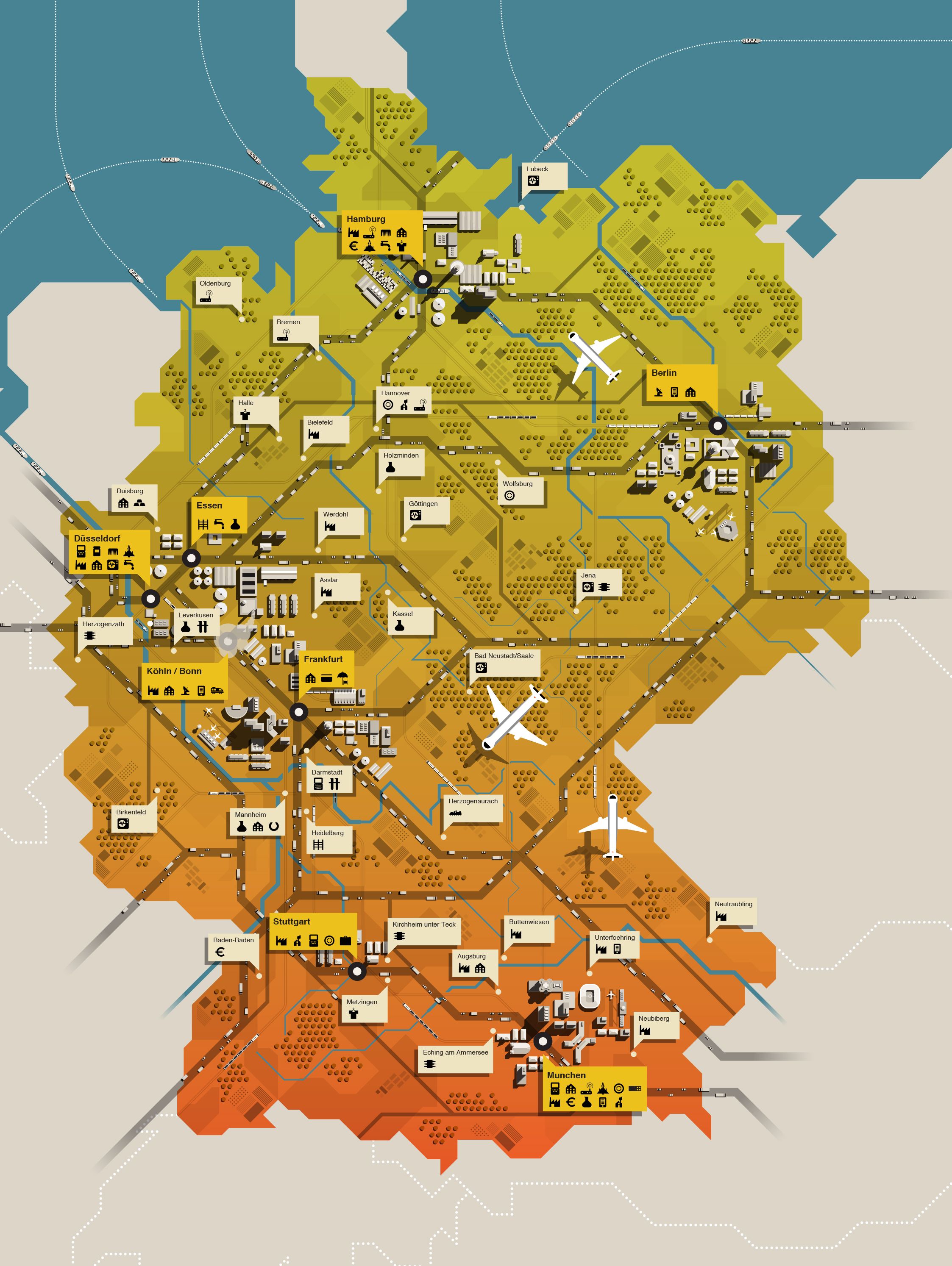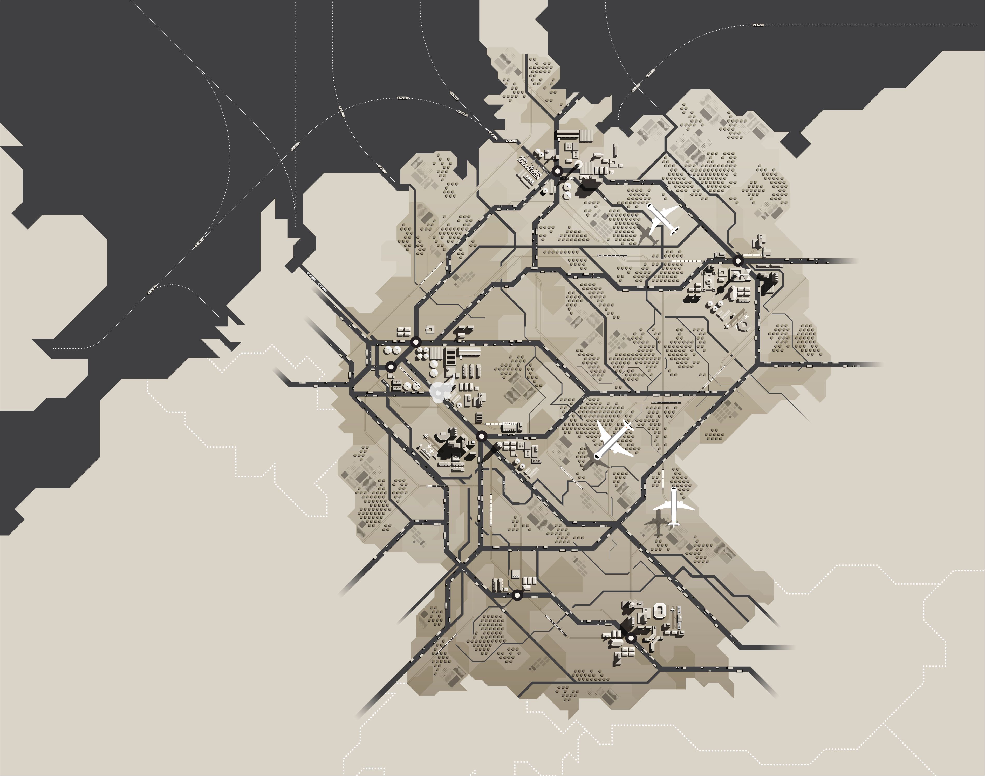 Este mapa de Alemania para la revista de la Banca Beremberg debía representar las distintas facetas de la industria alemana al tiempo que ilustraba su dinamismo y potencia sobre una capa de datos reales.