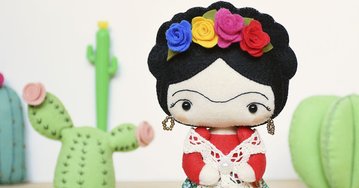 Esta muñeca de Frida Kahlo está inspirada en uno de sus cuadros más famosos. Todos los detalles que pueden identificar a la artista están incluidos en esta representación de tela creada por la profesora de Domestika Elena Sánchez Santos. Desde su diadema de flores hasta sus icónicos pendientes en forma de mano. Esta muñeca forma parte de una colección de tres muñecas que fueron subastadas para un acto benéfico.