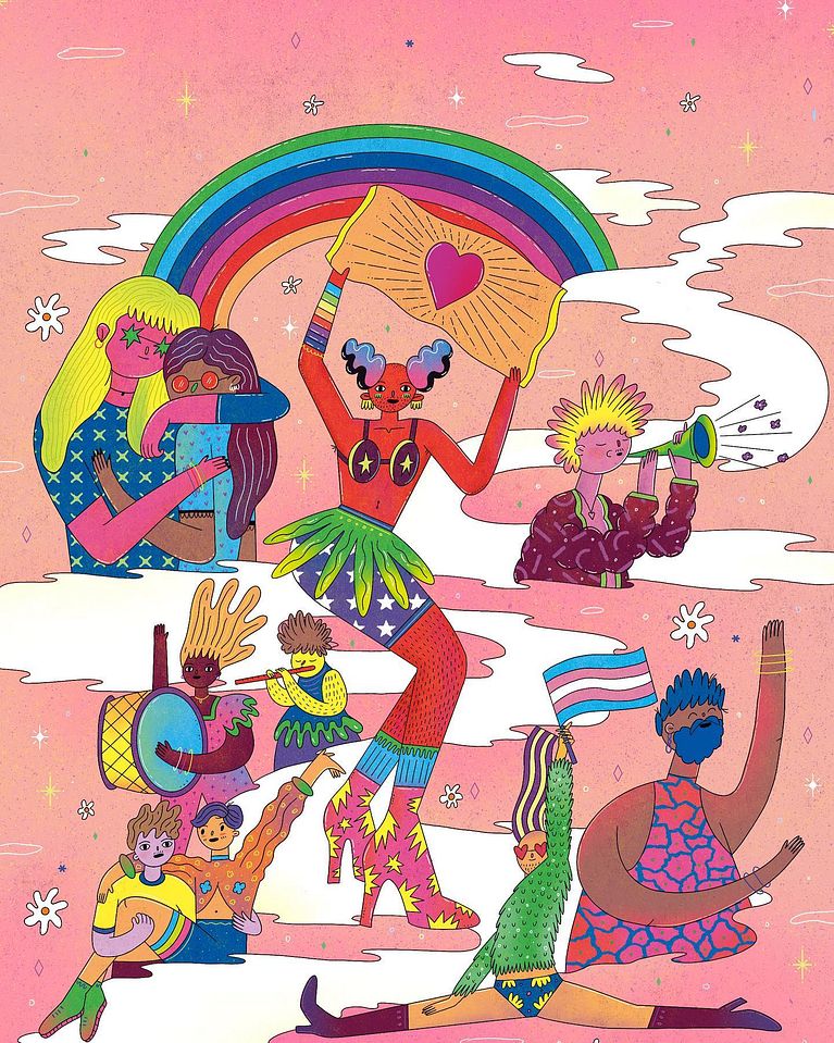 Bett compartió esta ilustración en la comunidad Domestika, con la siguiente explicación: “Hice esta obra para celebrar el mes del orgullo LGBTQIA+ 2022; me inspiré en las diferentes personas que he visto en espacios queer en el festival del Orgullo en Bristol, mi ciudad natal”.