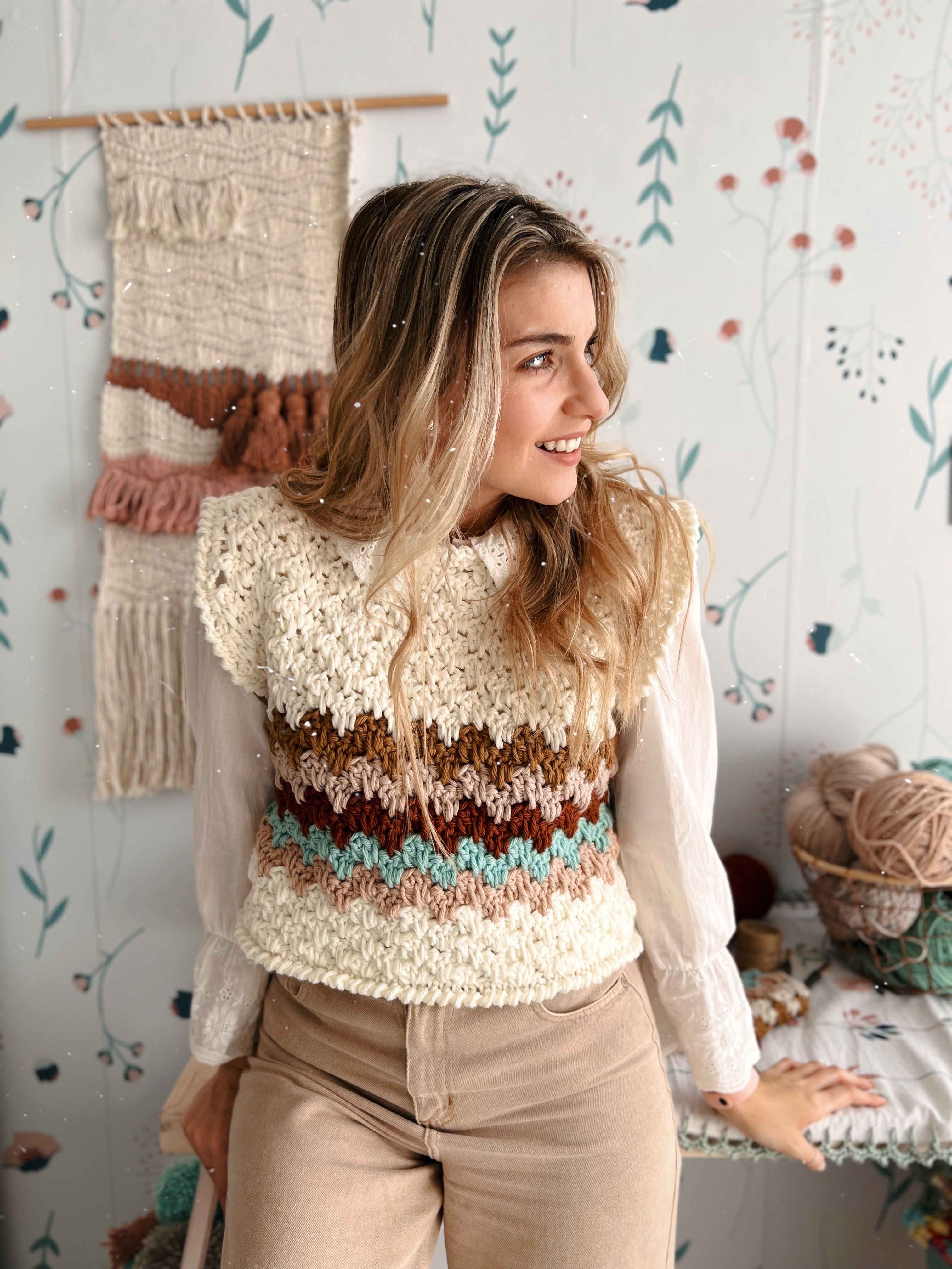 Su pasión por lo vintage y los colores pastel son las influencias principales de un estilo de crochet muy personal, con prendas florales, texturas muy llamativas y una fusión entre las tendencias más actuales y las prendas que marcaron época. En esta descarga, Alelí comparte un patrón para tejer un chaleco crop en crochet que ella llama chaleco girasol.