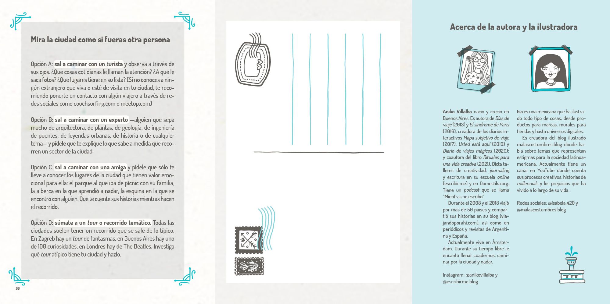 Los cuadernos de viaje de Aniko son un testimonio tangible de la introspección y la creatividad que fluyen cuando uno se sumerge en un viaje. En este documento que puedes descargar gratis, Aniko Villalba te invita a explorar la ciudad en la que vives y, a la vez, a conocerte más. Se trata de una serie de ejercicios prácticos sobre escritura creativa a partir de tu conexión con el entorno: lo que ves, lo que escuchas, lo que sientes, los olores, qué pensamientos vienen a tu cabeza, qué parte de tu cuerpo se despierta, qué tiempo hace ahí fuera y también dentro de ti, y un montón de sensaciones y propuestas que te ayudarán a explorar el mundo, a ti mismo y tu creatividad. Es decir, con estos ejercicios explorarás la ciudad que habitas terrenalmente y la de tu propio interior. Sólo necesitarás observar, despertar tus sentidos, poner foco en lo que tienes alrededor y tu propia escritura. Con este diario, no sólo recorrerás calles y lugares de tu ciudad, sino que también pasearás por las calles y lugares de tu interior.
