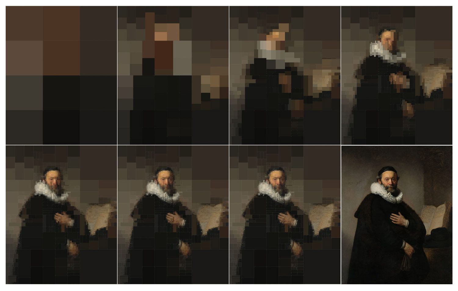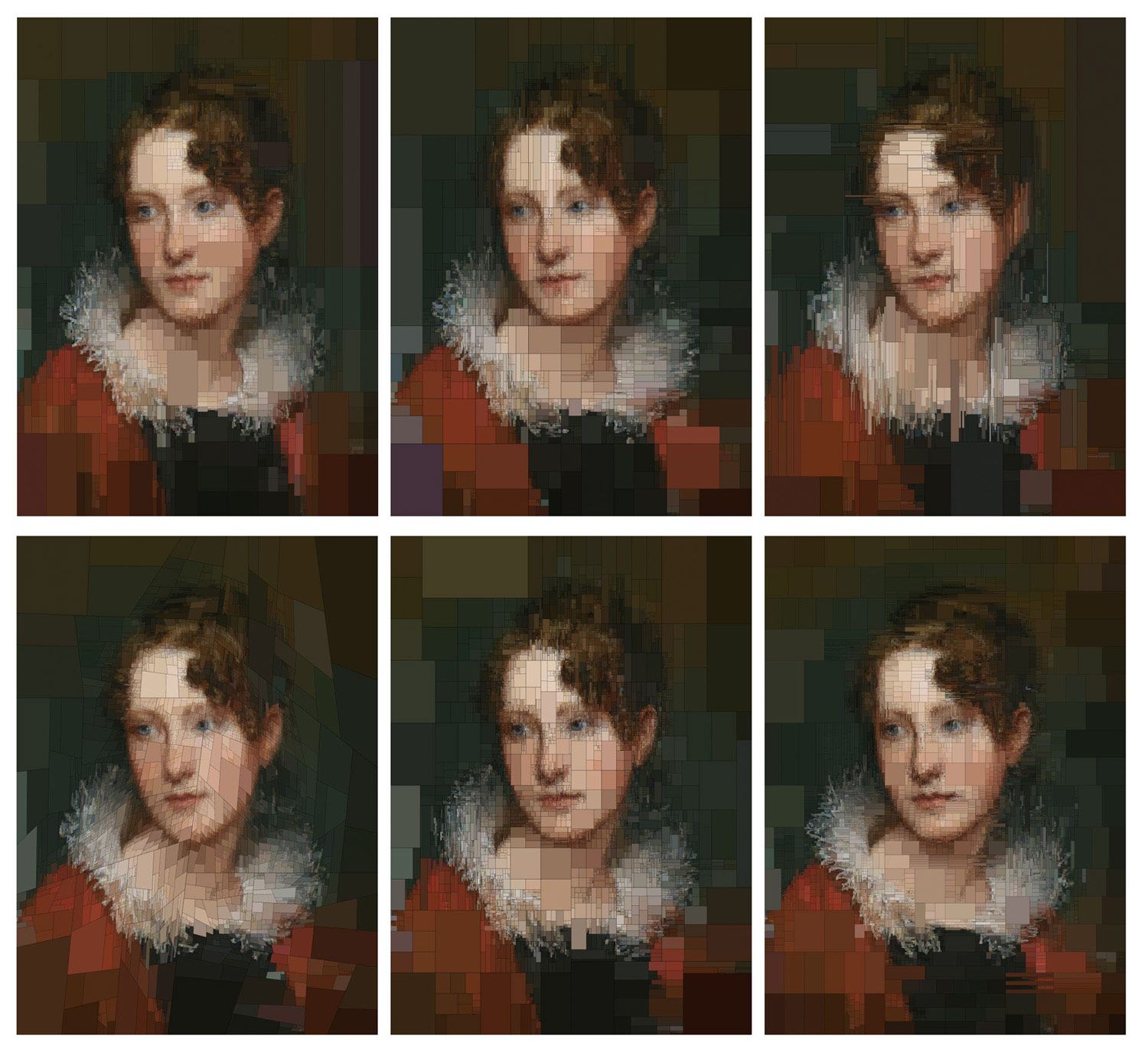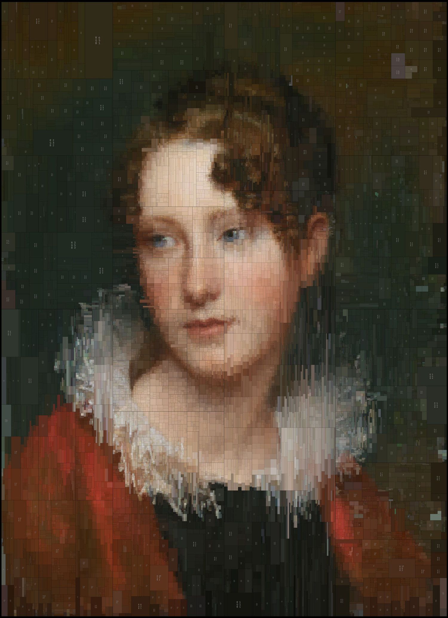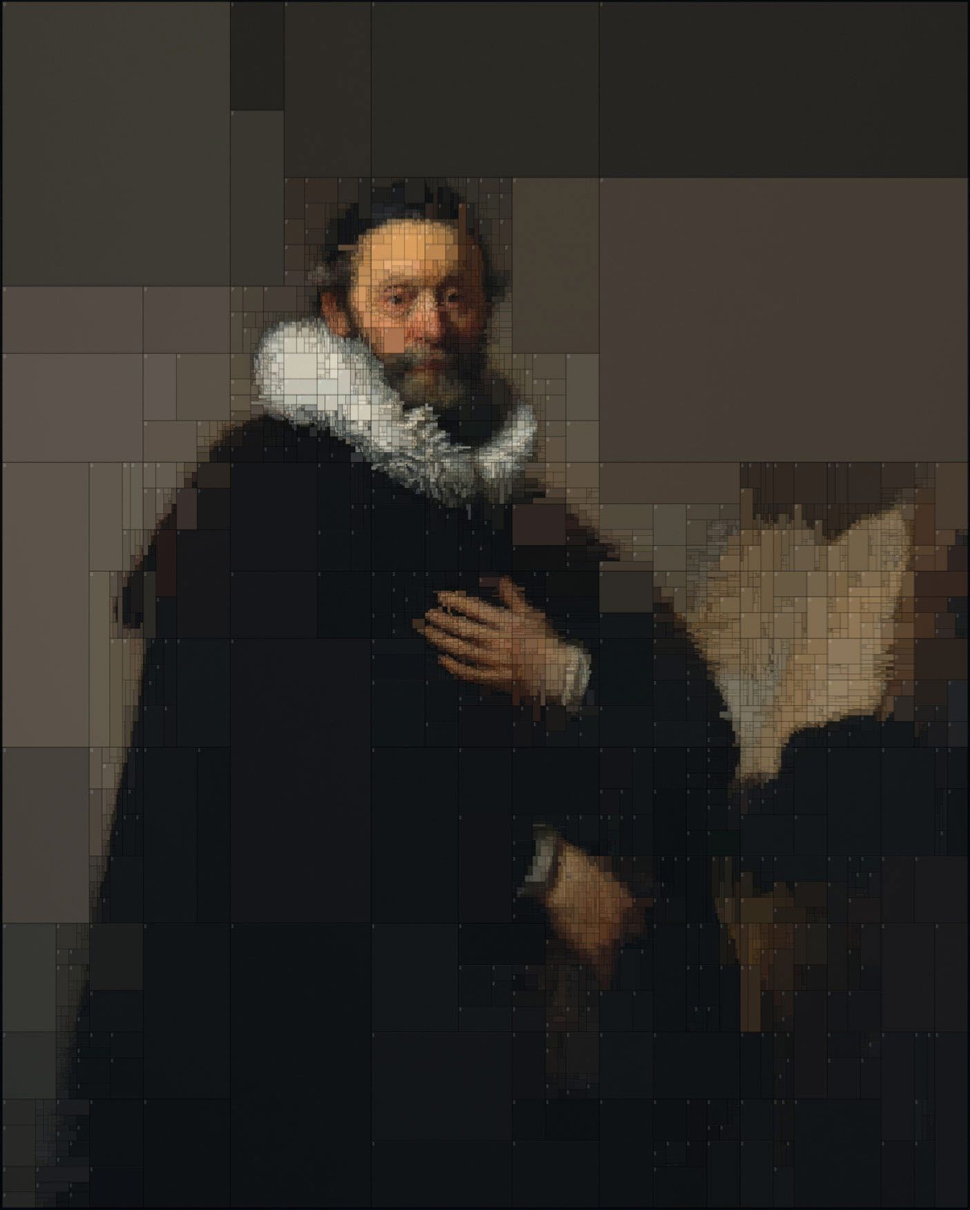 Las obras elegidas son dos de sus favoritas: Retrato de Rosalba Peale, de Rembrandt Peale y Retrato de Johannes Wtenbogaert, de Rembrandt Harmenszoon van Rijn. Utilizando Houdini subdividió las pinturas en cuadriláteros de diversas formas, correspondientes a cada uno de los tonos cromáticos utilizados en el cuadro. Dentro de cada rectángulo puede verse el valor RGB que le corresponde a dicho color.