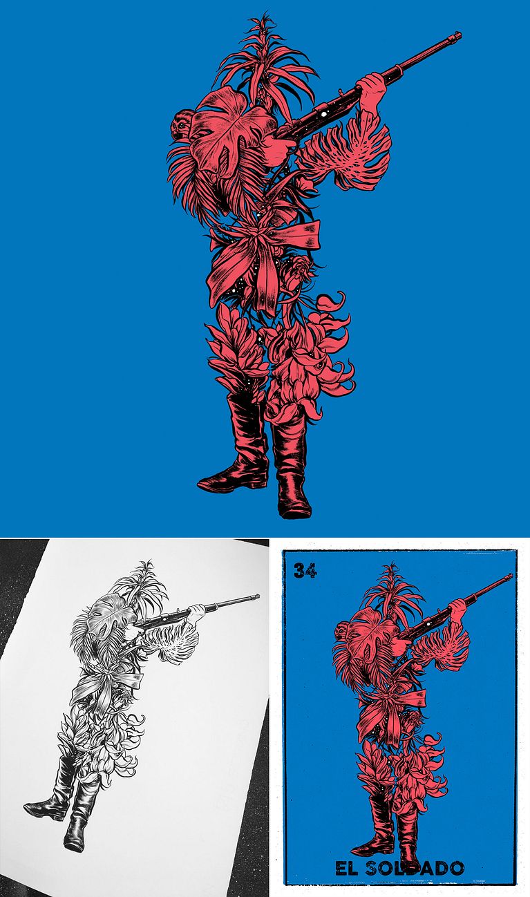 Cada uno de los ilustradores participantes en la lotería mexicana de Roger Omar eligió un número de la baraja y reinterpretó la carta a su manera, tomando como punto de partida el nombre representado y reimaginando su figura a través del propio estilo.