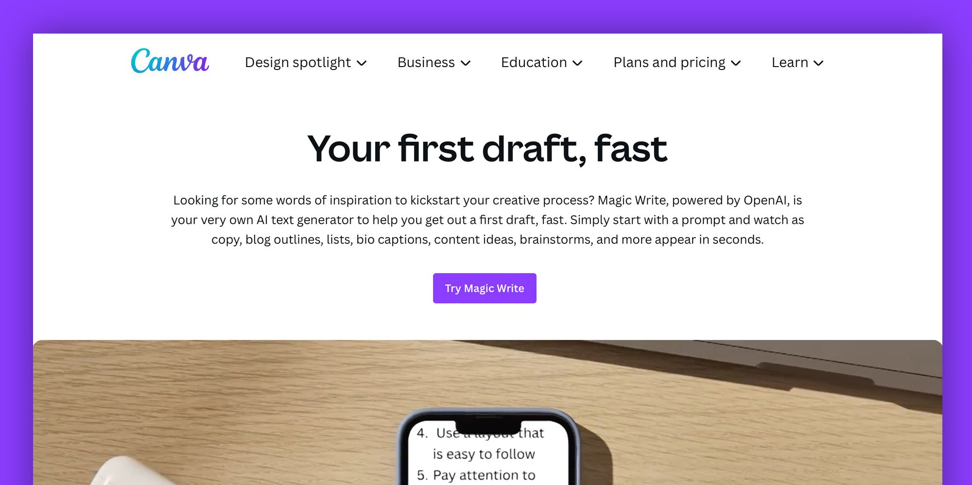Al utilizar Magic Write en Canva Docs, puedes ahorrar tiempo y esfuerzo en el proceso de creación de contenidos, lo que te permitirá centrarte en otros aspectos importantes de tu proyecto. Así que prueba Magic Write y experimenta la comodidad y eficiencia que aporta a tus esfuerzos de redacción.