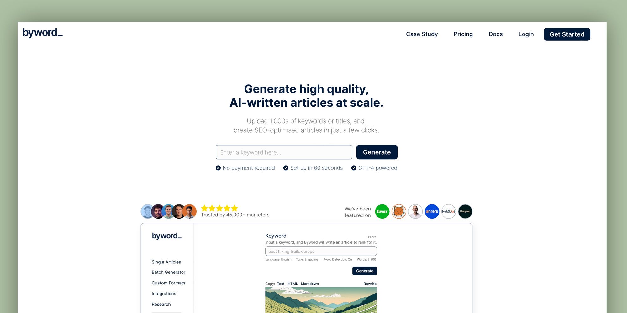 Te presentamos Byword, la herramienta de redacción de AI definitiva que agiliza la creación de artículos de alta calidad optimizados para motores de búsqueda sin ningún esfuerzo. Con sus funciones avanzadas y su interfaz fácil de usar, Byword permite a los creadores de contenidos generar contenidos atractivos y originales en una fracción del tiempo.