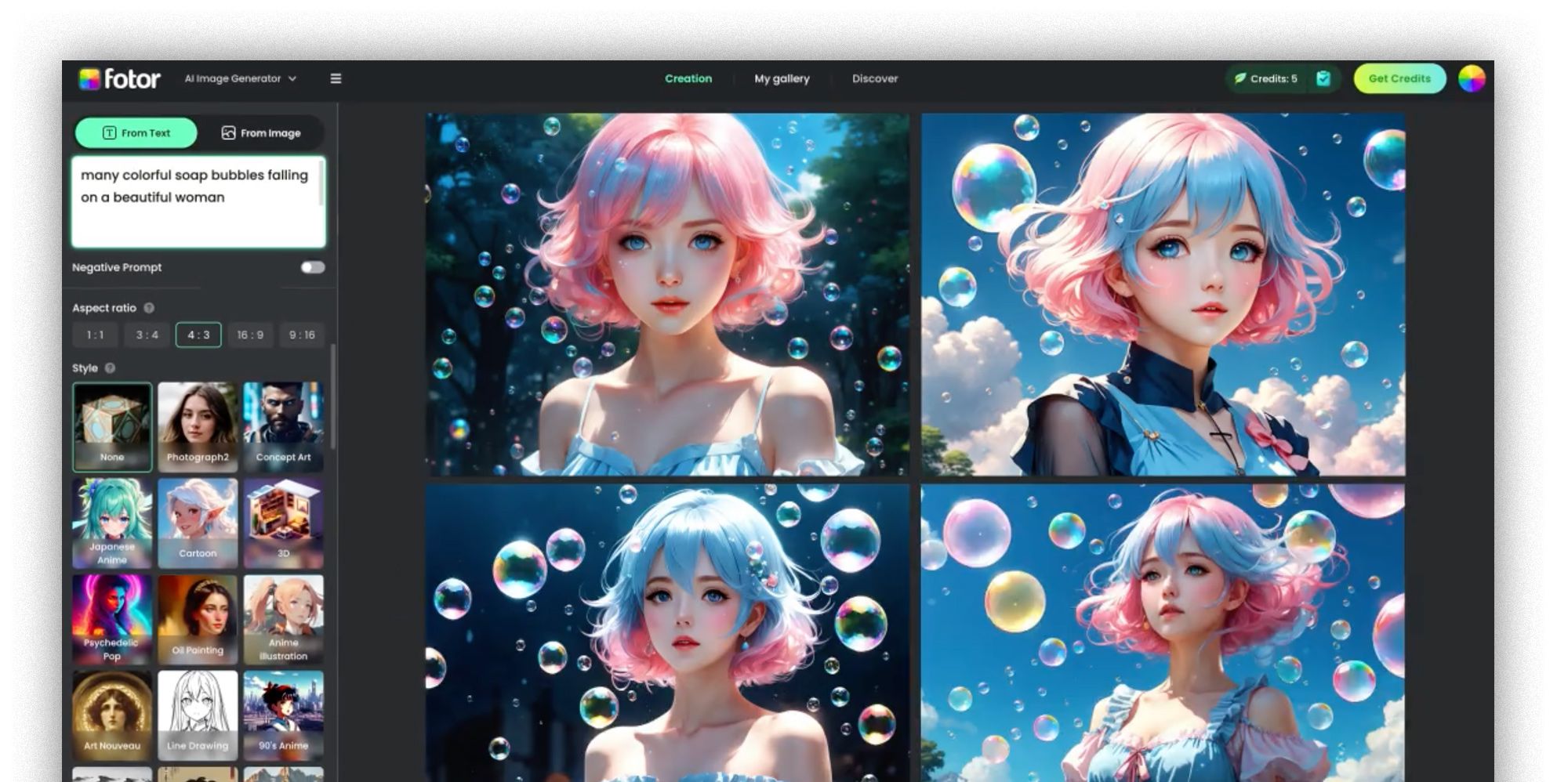 Aparte de sus capacidades de IA, también ofrece plantillas, elementos de diseño y herramientas de mejora de imágenes para llevar tus creaciones al siguiente nivel. Con su extenso abanico de funciones y una amplia selección de estilos artísticos, Fotor es una excelente opción para quienes buscan una herramienta completa de edición y diseño de imágenes.