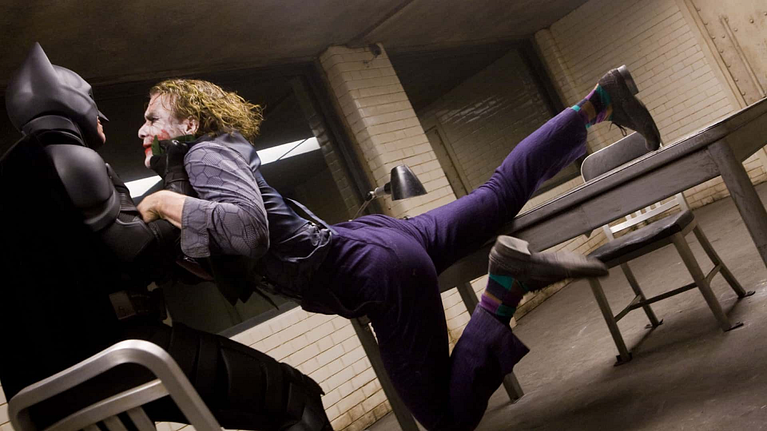 El ángulo de cámara holandés o plano holandés es aquel en el que la cámara está inclinada en un ángulo diagonal, puede crear una sensación de inestabilidad o tensión. Este ángulo se utiliza a menudo para representar situaciones de caos o inquietud, como se ve en esta imagen de El caballero oscuro.