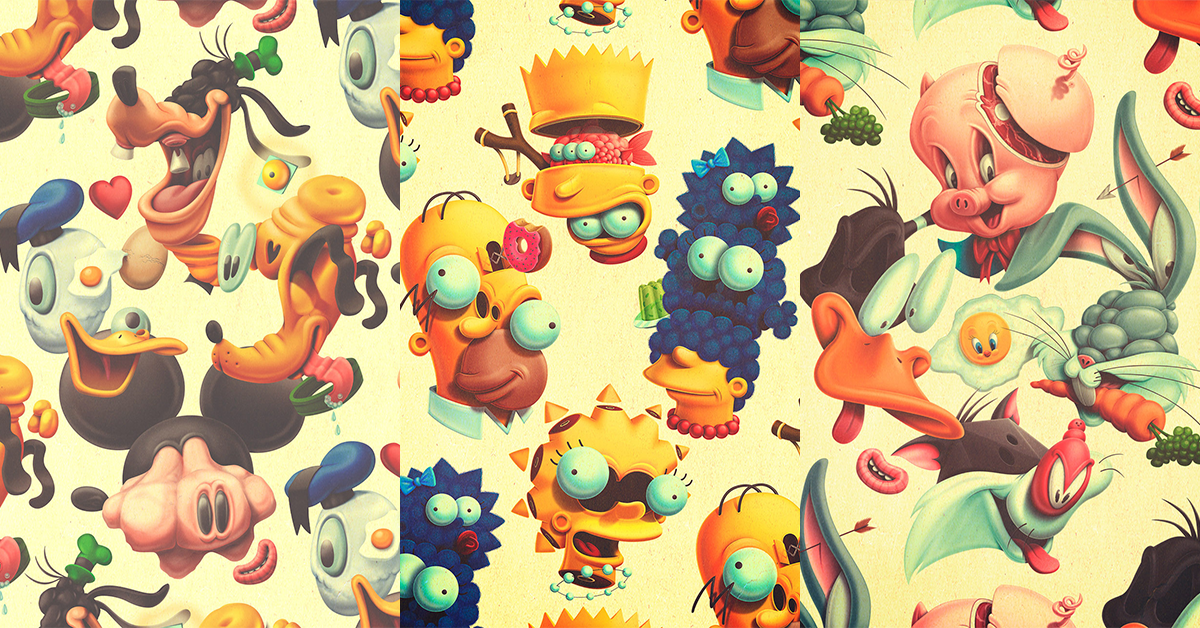 Un buen ejemplo de ello son las ilustraciones descompuestas de Mickey Mouse, los Looney Tunes, los Simpson o el Pato Donald. Estos reconocibles personajes, que durante años hemos visto con los ojos pegados a la pantalla, se deconstruyen al más puro estilo daliniano para devolvernos una visión psicotrópica de los clásicos de los dibujos animados cuyas aventuras hemos visto una y otra vez.