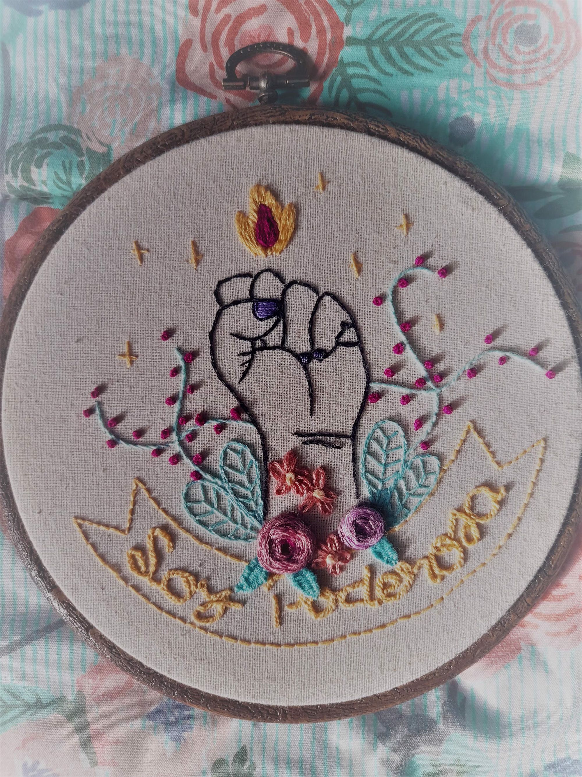 Maria Fernanda Díaz Villegas es una bordadora amateur que inició en el bordado con puntadas básicas en el 2019 y desde entonces no ha parado. Actualmente se encuentra tratando de llevar sus bordados al siguiente nivel, incorporando texturas y pinturas. Para esta fecha tan especial creó un proyecto que reivindica el papel de las mujeres en la sociedad mediante el bordado, un arte con una fuerte carga simbólica