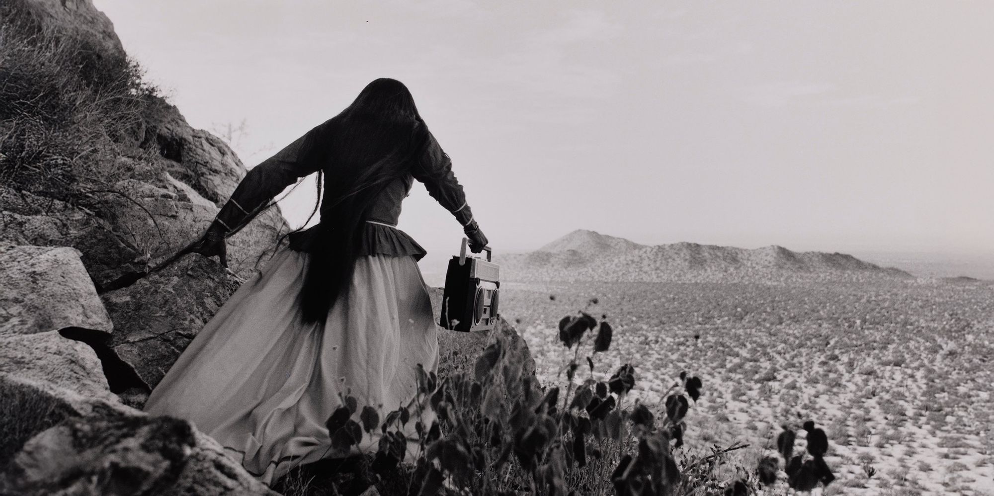 "Mujer Ángel": Imagen icónica tomada en el desierto de Sonora, que muestra a una mujer indígena seri con un radiocasete en la mano, simbolizando la coexistencia entre modernidad y tradición.