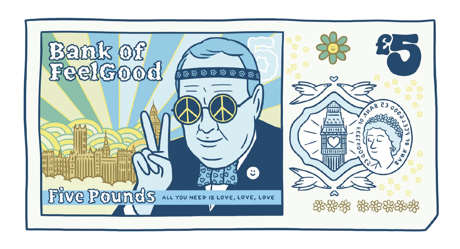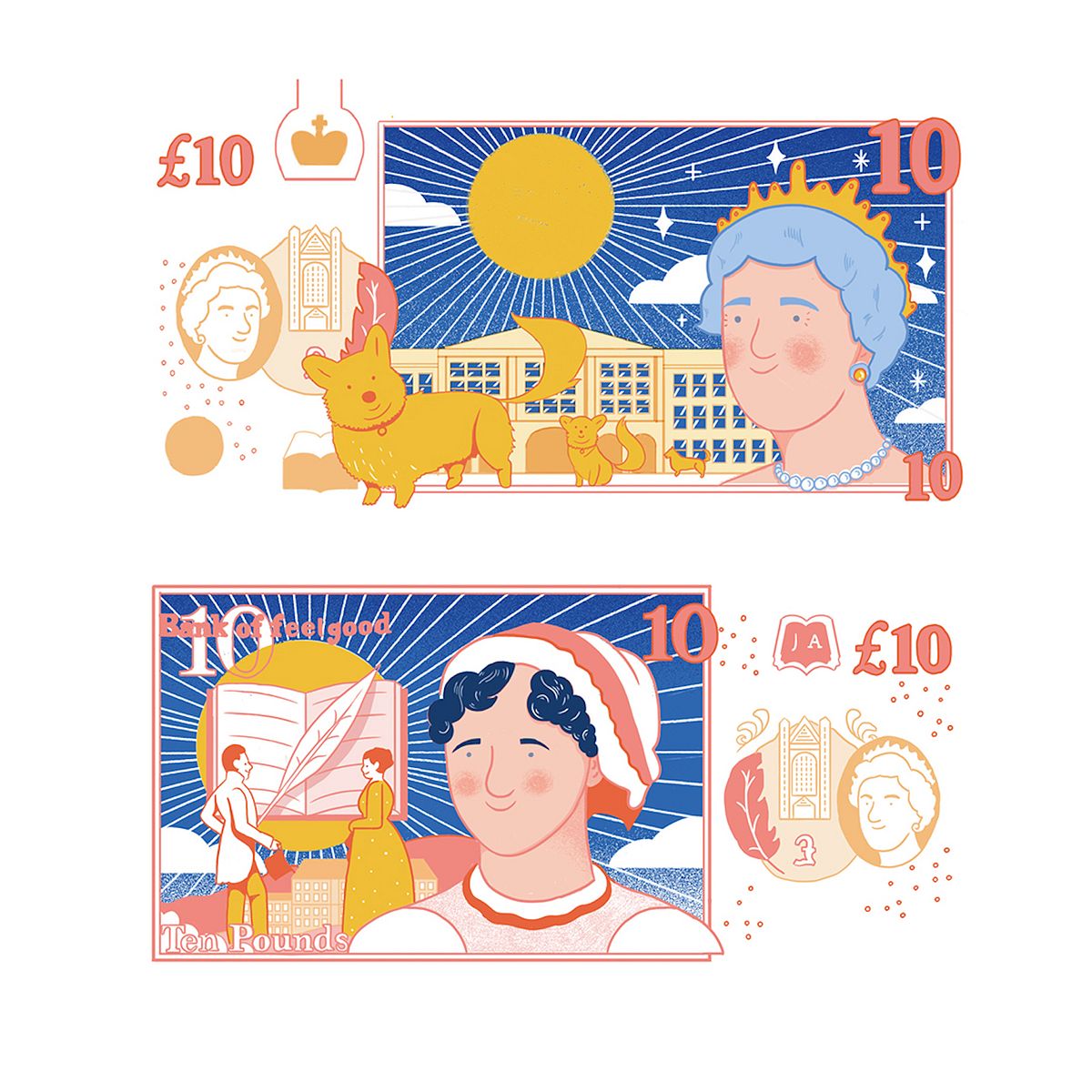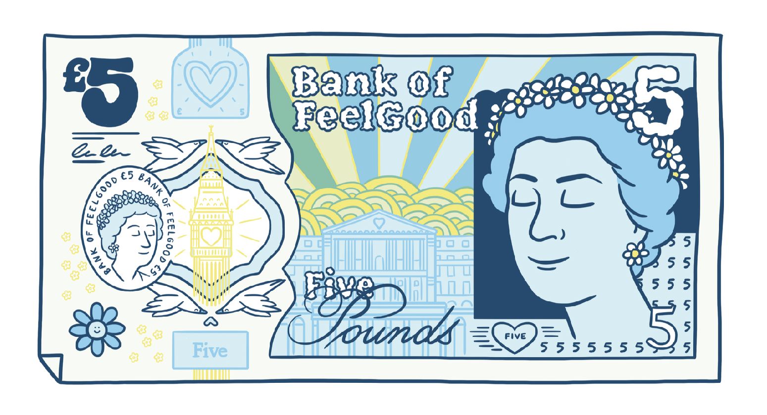 Pese a que no están aprobados por el Banco de Inglaterra, y por lo tanto, no están en circulación, se trata de una versión renovada y risueña de los billetes actuales ingleses. La compañía ha encargado a cuatro artistas ingleses, Matt Blease, Michael Driver, Joey Yu y Nadia Akingbule, que reimaginen su diseño sin alterar la aparición de los personajes.
