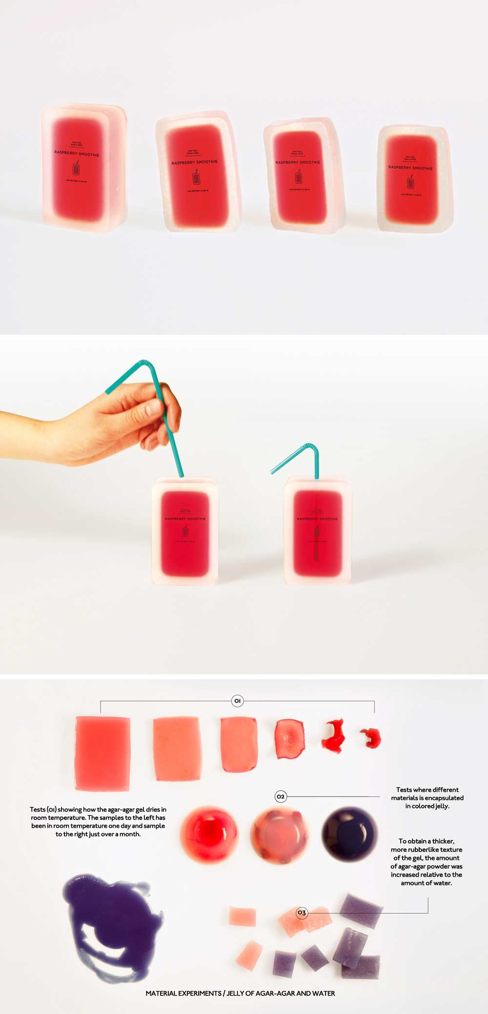 El agua y el agar son los únicos ingredientes que se utilizan para hacer este empaque, por lo mismo tiene la misma vida útil que los líquidos que contenga. Es usado para líquidos que necesiten estar refrigerados como jugo, smoothies y lácteos.