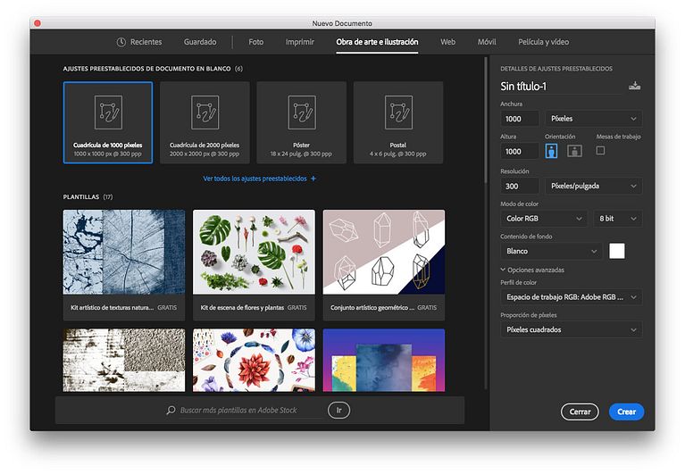 Lo primero que debes hacer es preparar el documento sobre el que trabajarás tu collage. Para ello abre un documento nuevo en Adobe Photoshop (Archivo > Nuevo) y selecciona el tamaño y resolución que más se acomode a las necesidades de tu proyecto. Recuerda que también deberás tener en cuenta el modo de color que vas a trabajar, dependiendo de si se trata de un proyecto digital (será en RGB) o que se utilizará en una publicación impresa (en CMYK), y el color del fondo.