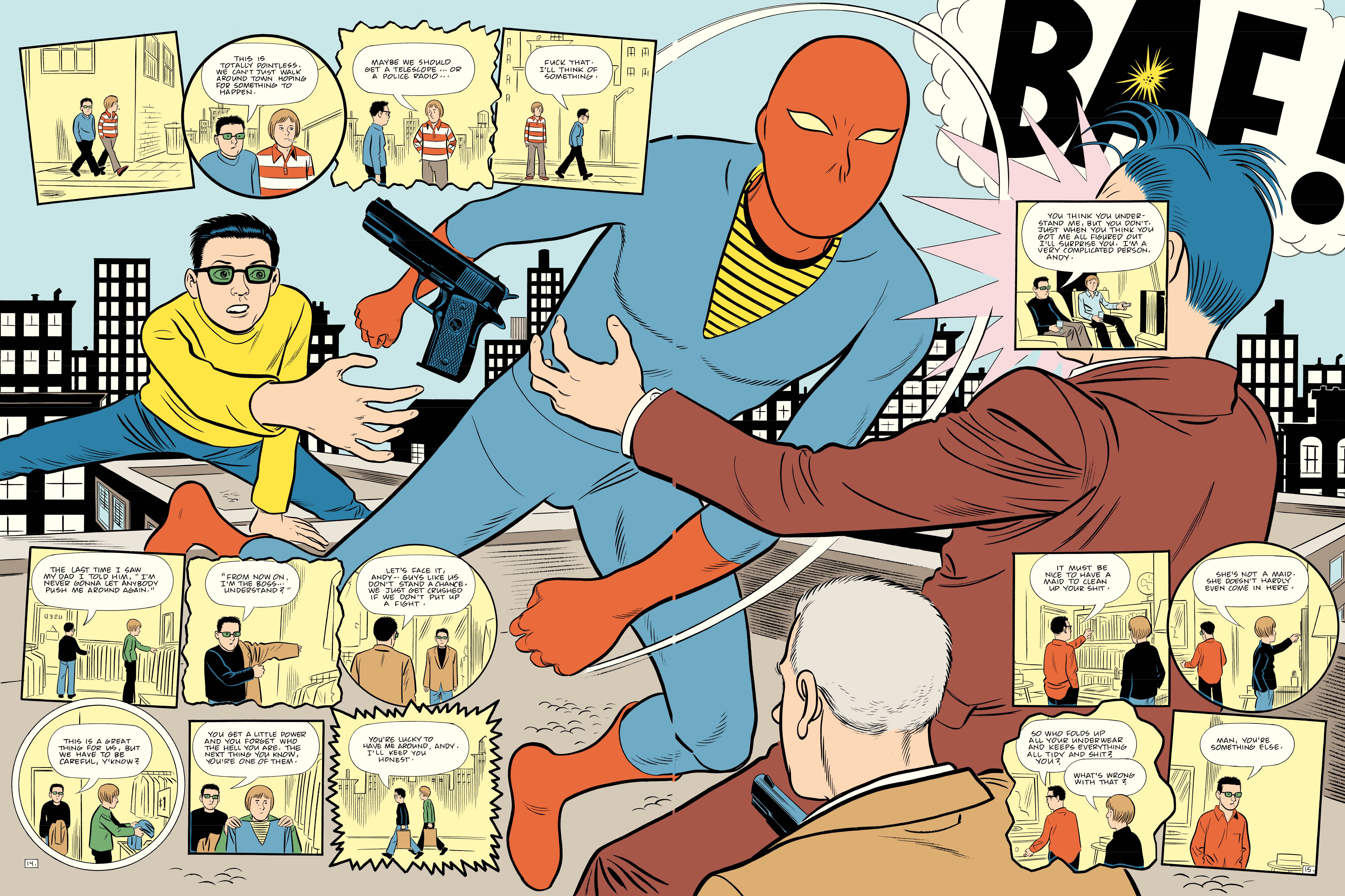 El autor de Ice Haven es sinónimo de dos cosas: de un estilo de dibujo claro con un extraordinario tratamiento del color, inspirado en el cómic clásico estadounidense y la cultura visual de la primera mitad del siglo XX; y de argumentos que van de lo conspiranoico y la psicodelia hasta la observación costumbrista más brutal. Y siempre con personajes, como mínimo, extraños: "intento empezar con personajes que no entiendo mucho, que son complicados… me gusta lidiar con gente así".