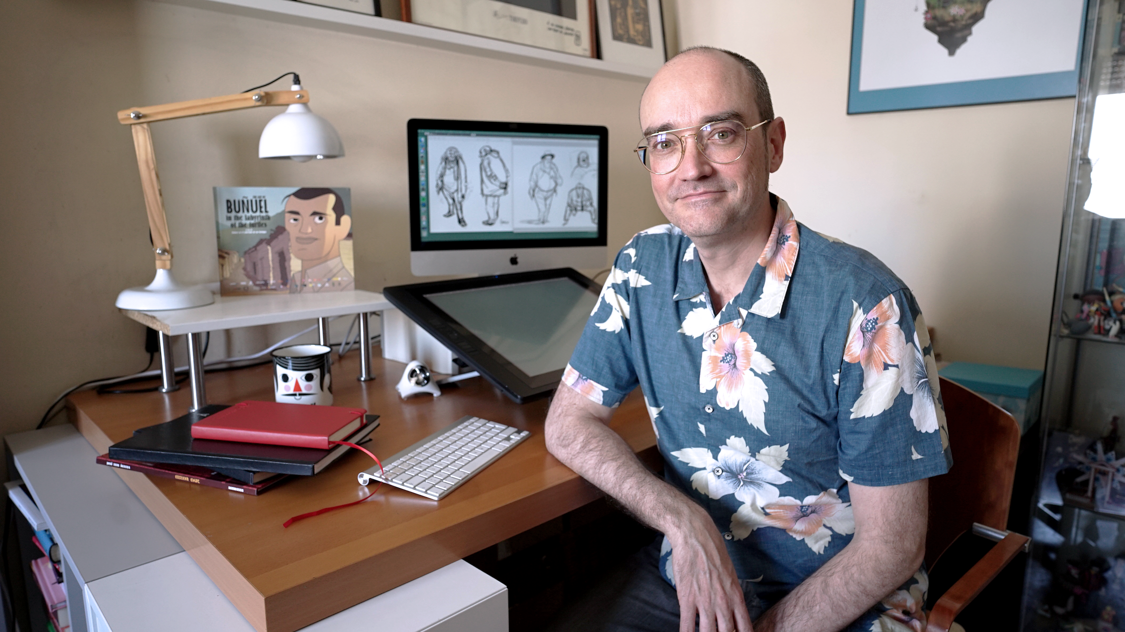 José Luis Ágreda, ilustrador y diseñador de personajes que ha colaborado durante años con medios tan importantes como El País o El Jueves, inicia su carrera como director de arte en el cine de animación con esta película. Acudimos a su estudio, en Sevilla, para que nos cuente su experiencia y nos explique cómo es animar a uno de los directores de cine más famosos del siglo XX.