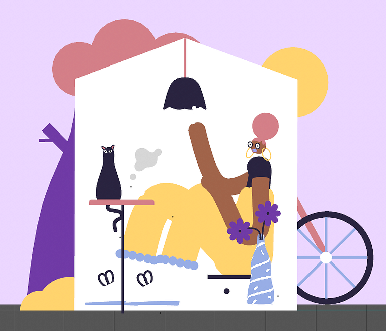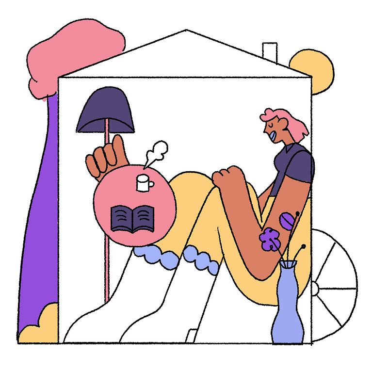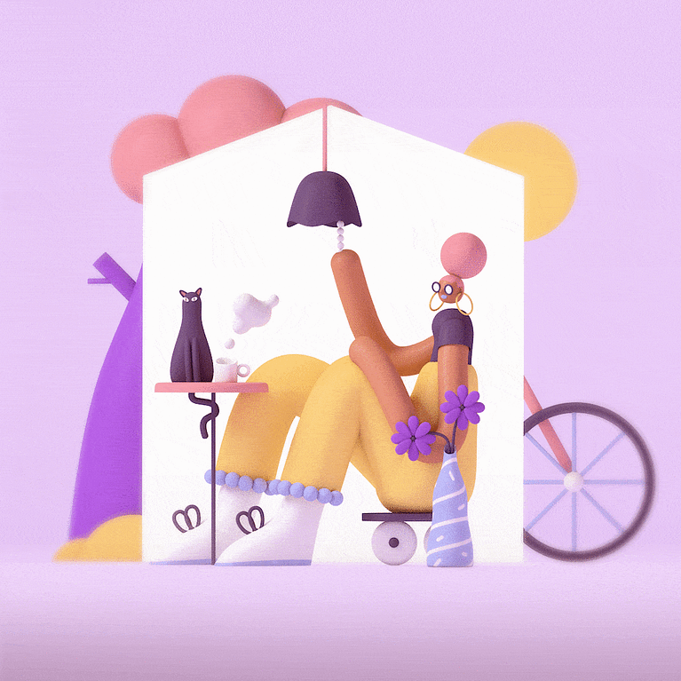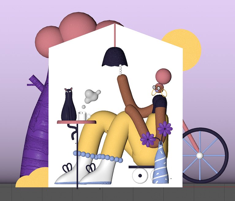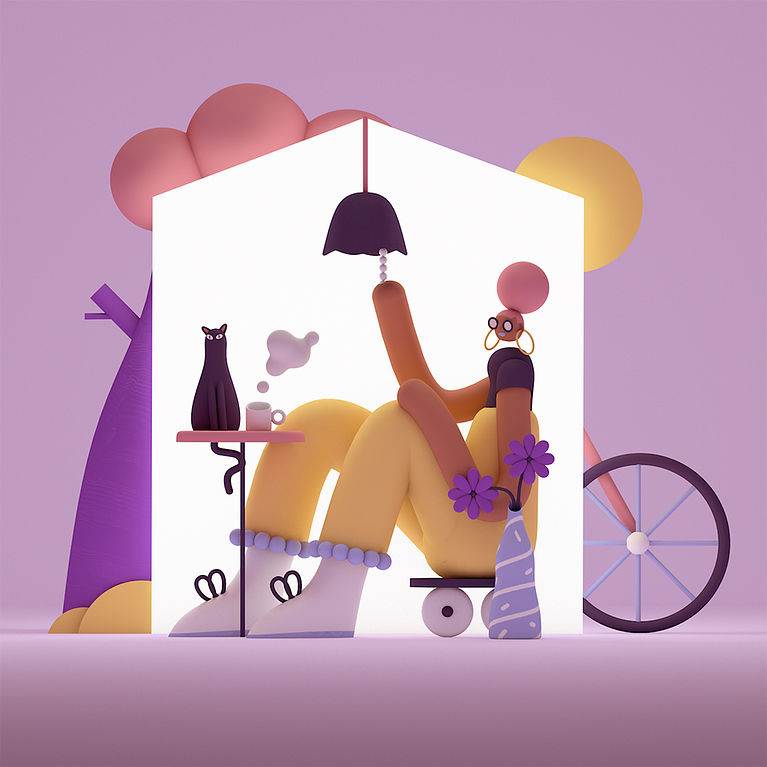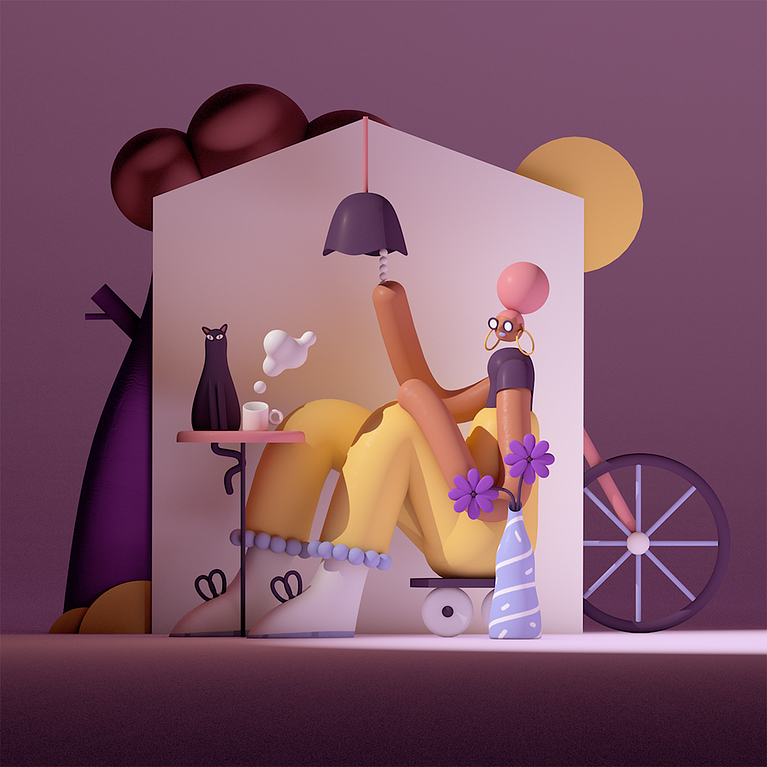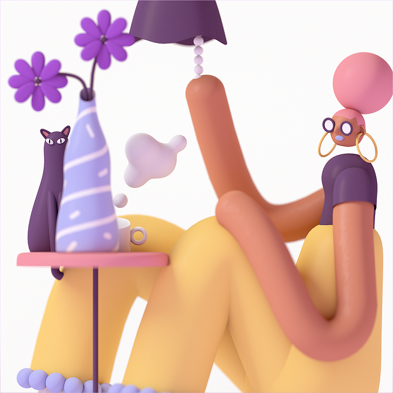 En esta pieza realizó ilustración en 3D, por lo que el resultado tiene sombras y luces que dan diferentes tonalidades a las había elegido. Hay que tomar en cuenta la intención y el concepto principal, en este caso el ilustrador quería transmitir comfort y tranquilidad, por lo que usó una paleta de colores más amigables y alegres.