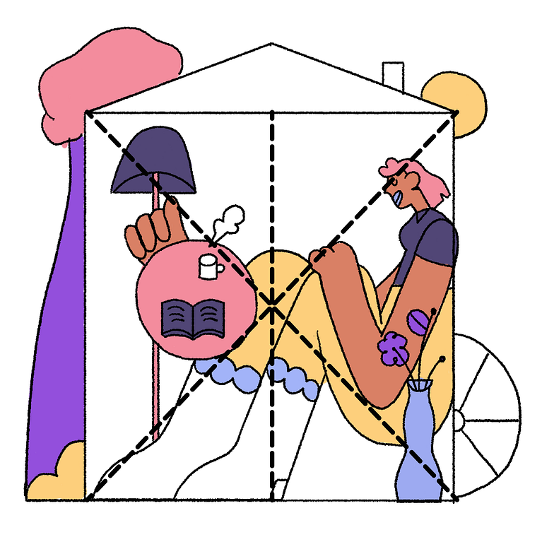 Disfruta jugar con las proporciones y tamaños de las cosas, tomando formas básicas para crear distintos elementos; todo esto lo toma en cuenta desde el primer boceto. Para esta pieza en específico, “mi idea principal era hacer una persona dentro de una casa en donde se sintiera un ambiente de tranquilidad, como cuando regresas del trabajo o de un viaje”.