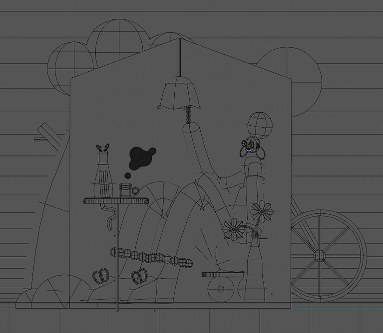 Cuando el boceto está listo, comienza a crear los elementos que, como ya mencionamos, empieza a partir de formas básicas para después modelarlas en Cinema 4D: "Trato de apegarme lo más posible a mi boceto, lo más sencillo que se pueda. Hay que tomar en cuenta que en el camino se pueden presentar cambios si es que encontré mejores formas de hacerlo o añado nuevas ideas. Por ejemplo, en esta ilustración cambié la posición de la mesa y agregué nuevos elementos".