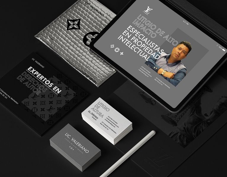 Lo más complicado fue encontrar el logotipo en vectores de Louis Vuitton, además de seleccionar una tipografía para el wordmark de Licenciado Valeriano. También, encontrar la fotografía del abogado y recortarla para montarla sobre los mockups.