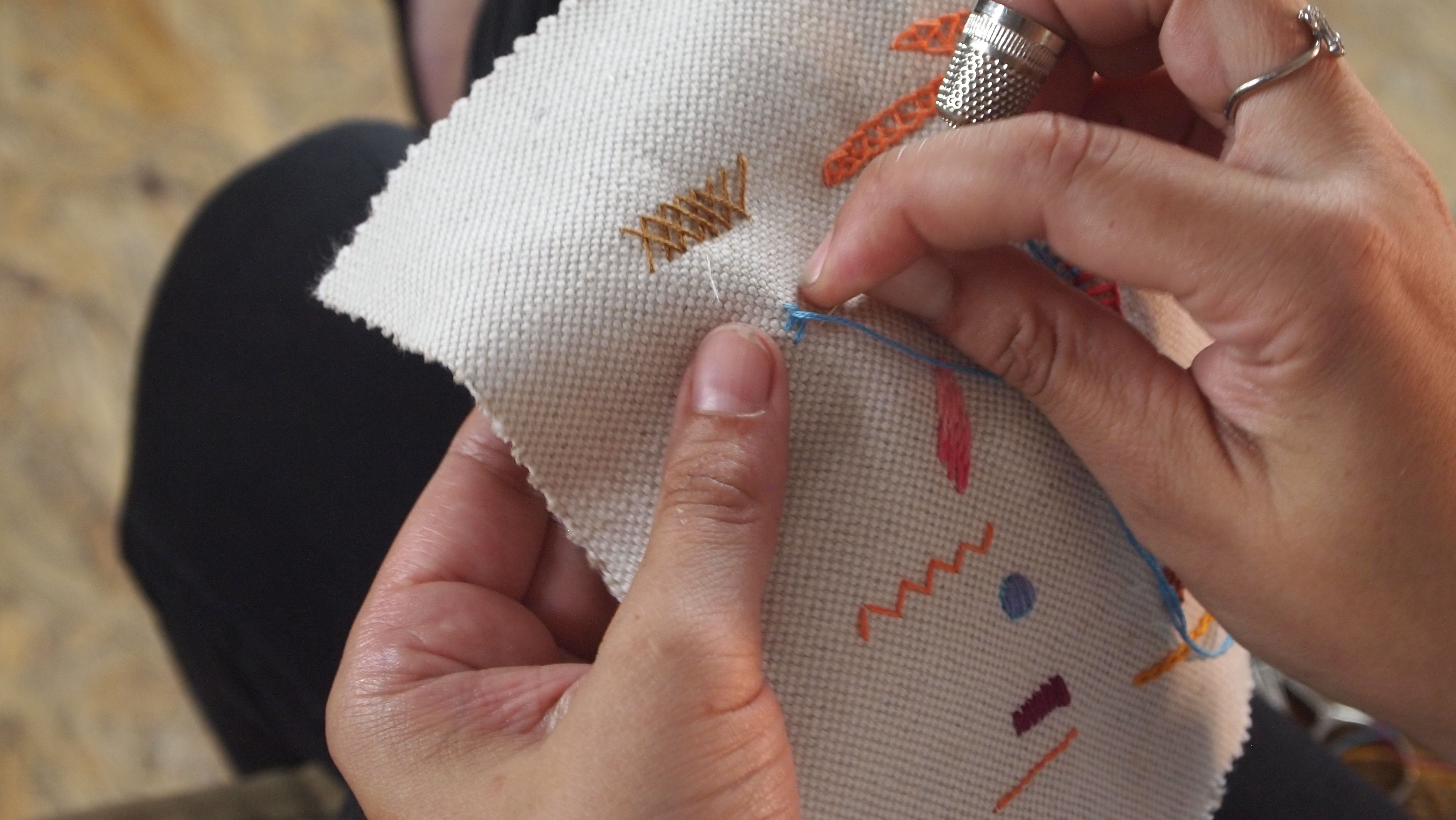 Su talento la ha llevado a trabajar para grandes firmas e instituciones como Hermès, Carolina Herrera y el Museo Thyssen, entre muchos otros. Y ahora comparte con Domestika una guía de puntos básicos de bordado en la que explica claramente y con dibujos sencillos, distintas puntadas clave como el punto de bastilla, el de flecha, el de cruz, el de nudo francés o el punto de hoja.