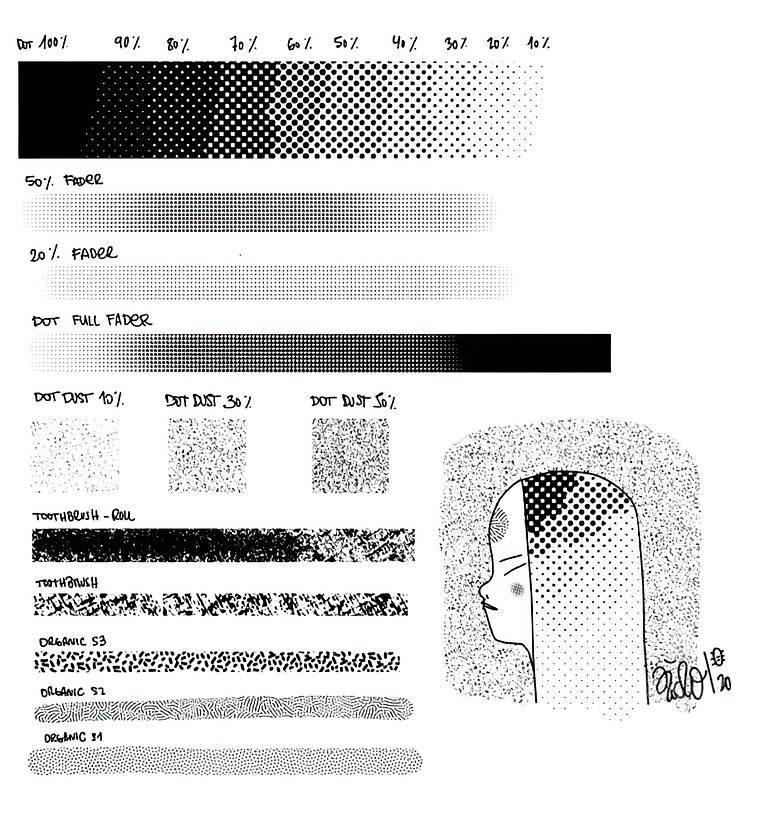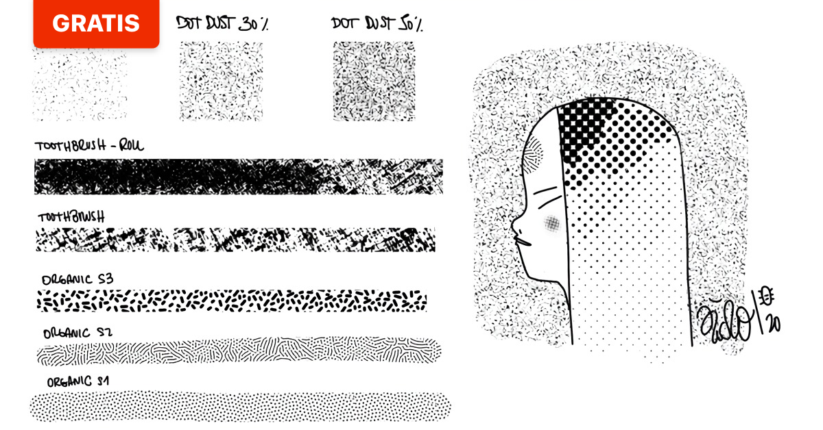 Se trata de las clásicas texturas con porcentajes fijos o dinámicos que se modifican con la propia presión del lápiz. Además, en este pack, el ilustrador ha añadido otras brochas más orgánicas perfectas para experimentar e incluir en ilustraciones de aspecto más urbano... ¡o lo que tú quieras!