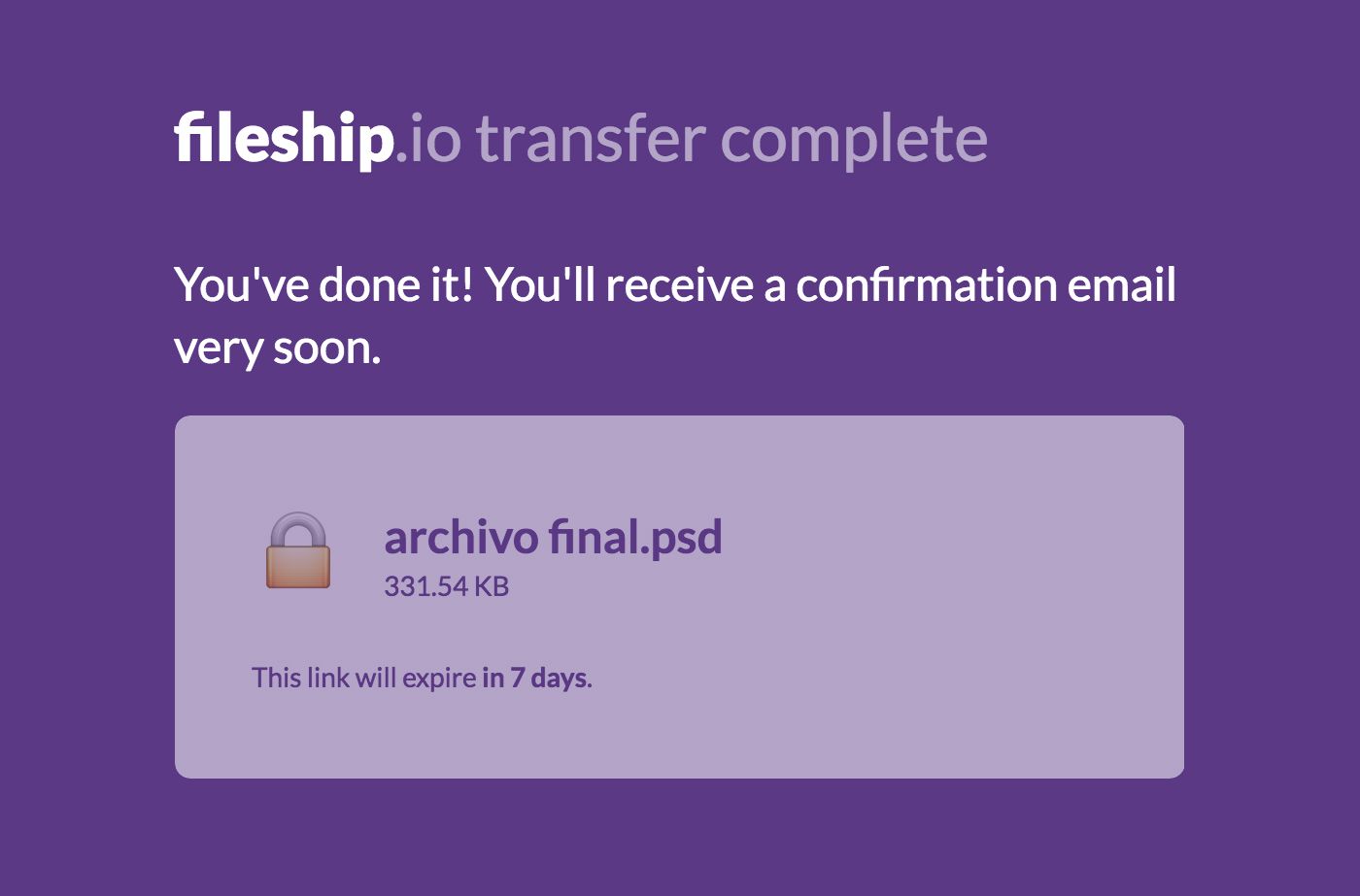 Finalmente te llega por correo electrónico un link para que se lo reenvíes al cliente. Cabe destacar que los archivos tienen una caducidad de 7 días.