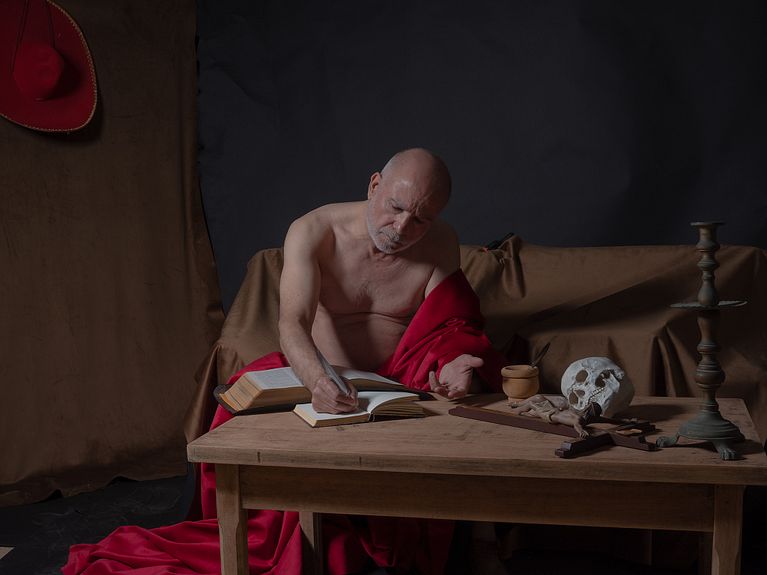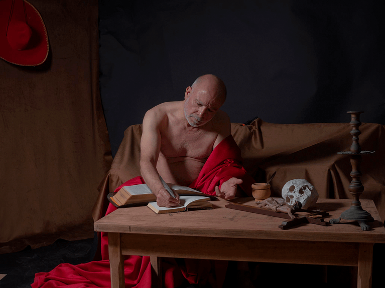 La idea era representar y adaptar la pintura San Jerónimo escribiendo, de Caravaggio: