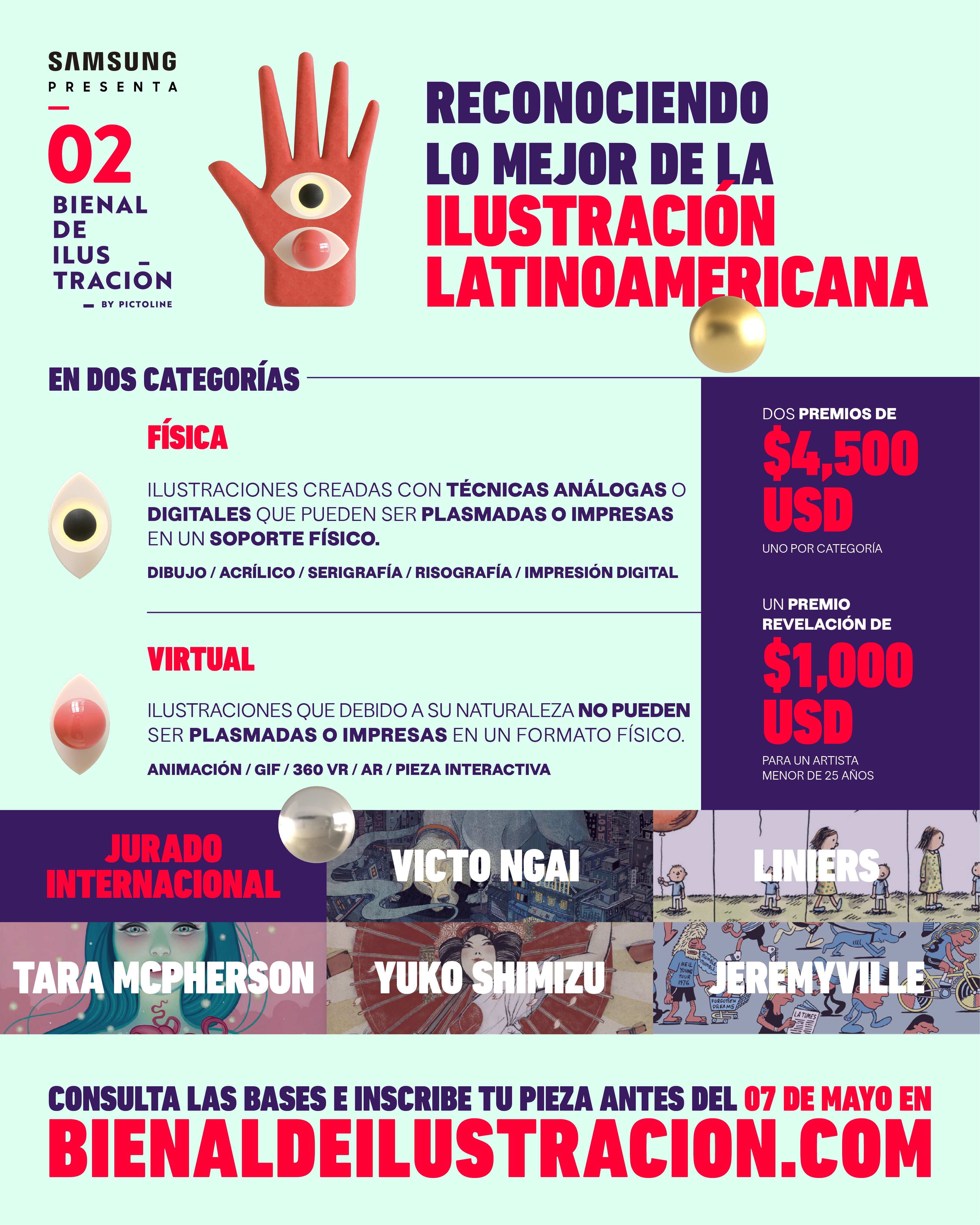 Las obras físicas son aquellas realizadas con técnicas análogas o dogales, pero impresas o plasmadas en un soporte físico (por ejemplo dibujo, acrílico, serigrafía, risografía, impresión digital, etcétera). Las obras virtuales son aquellas que no pueden imprimirse o plasmarse físicamente (como animación, GIF, 360 VR, realidad aumentada, etcétera). Habrá un total de 80 finalistas.