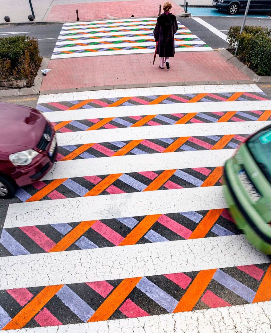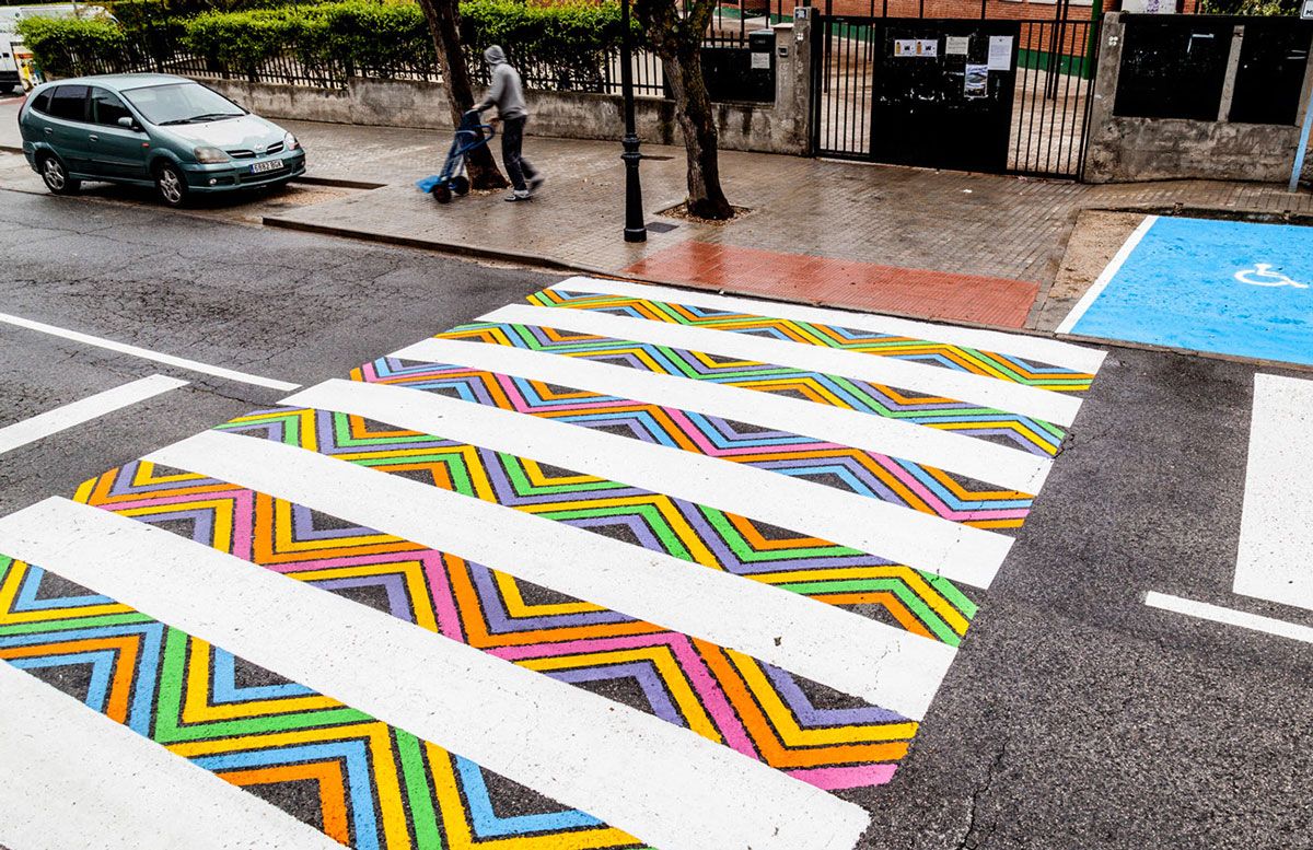 La obra de este artista búlgaro afincado en España consiste en la intervención de 13 pasos de peatones de una localidad cercana a Madrid, dejando intactas las reglamentarias líneas blancas, pero dotándolas de un nuevo entorno que funciona no sólo para embellecer el lugar que ocupan sino, también, para hacerlos más visibles tanto para conductores como para peatones.