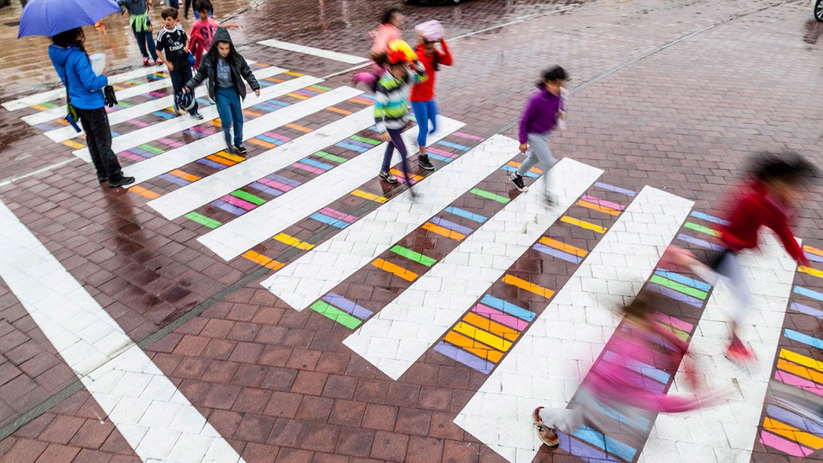 Las figuras geométricas y los colores vibrantes brotan de la calzada transformando una, aparentemente aburrida, senda peatonal en un objet trouvé multicolor que permite a los viandantes interactuar con el arte incluso de una manera involuntaria.