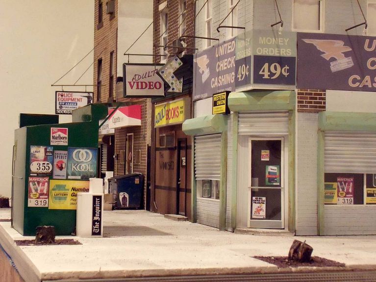 El resultado es una maqueta hiperrealista de papel a escala 1:12 en la que todos los detalles han sido cuidados con mimo. La cartelería roída, las aceras manchadas y las paredes desconchadas es lo que diferencia la obra de Drew Leshko de un impoluto proyecto de arquitectura.