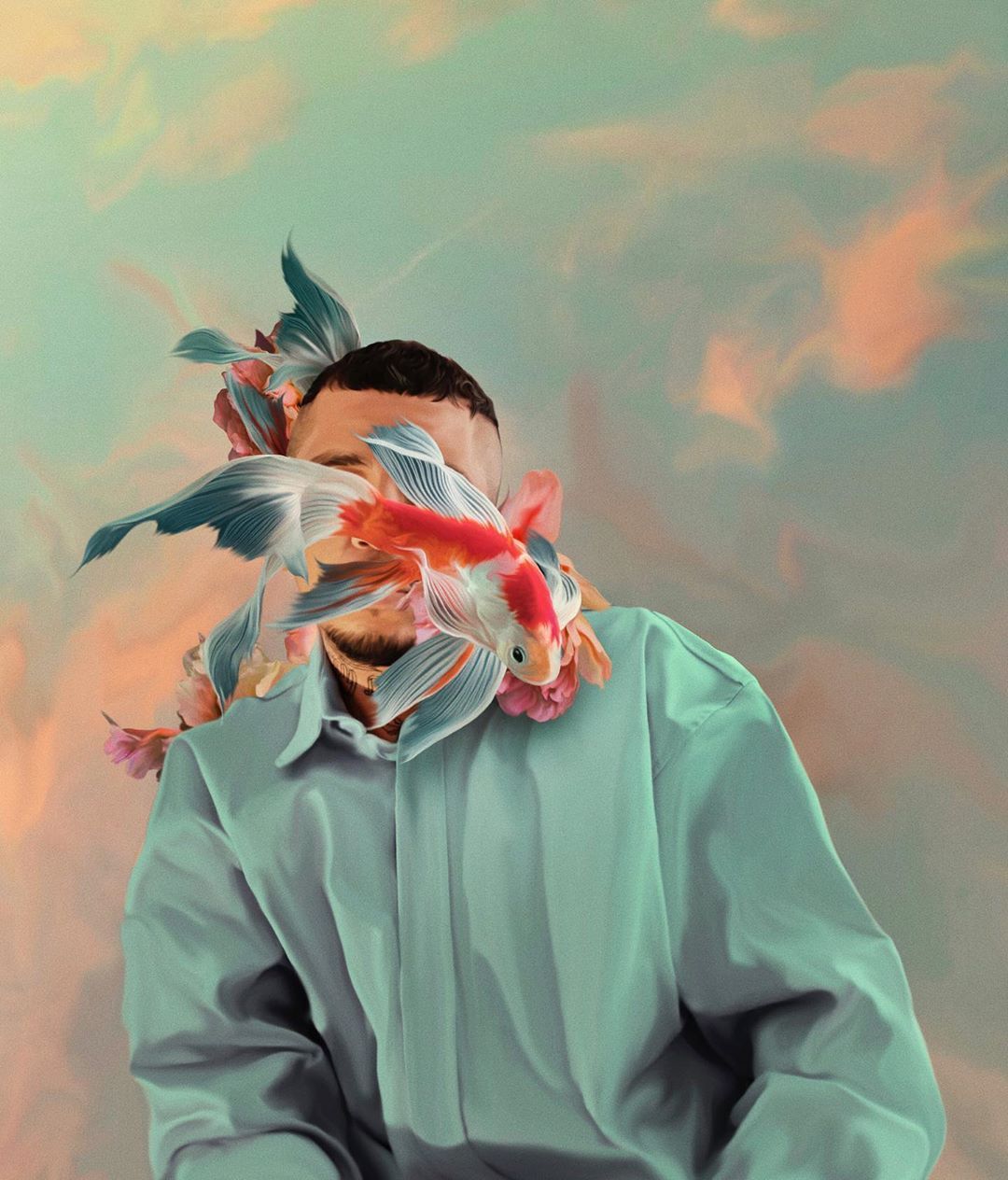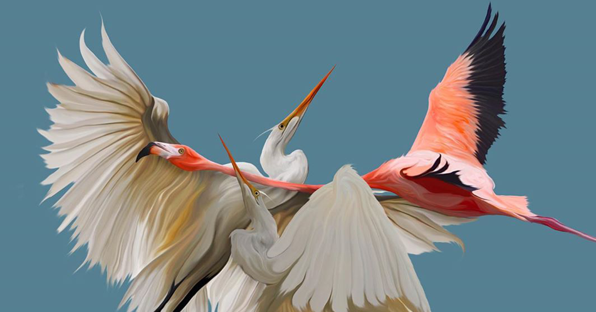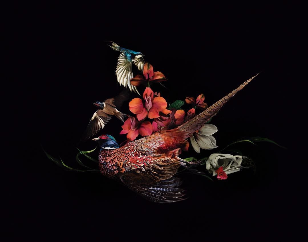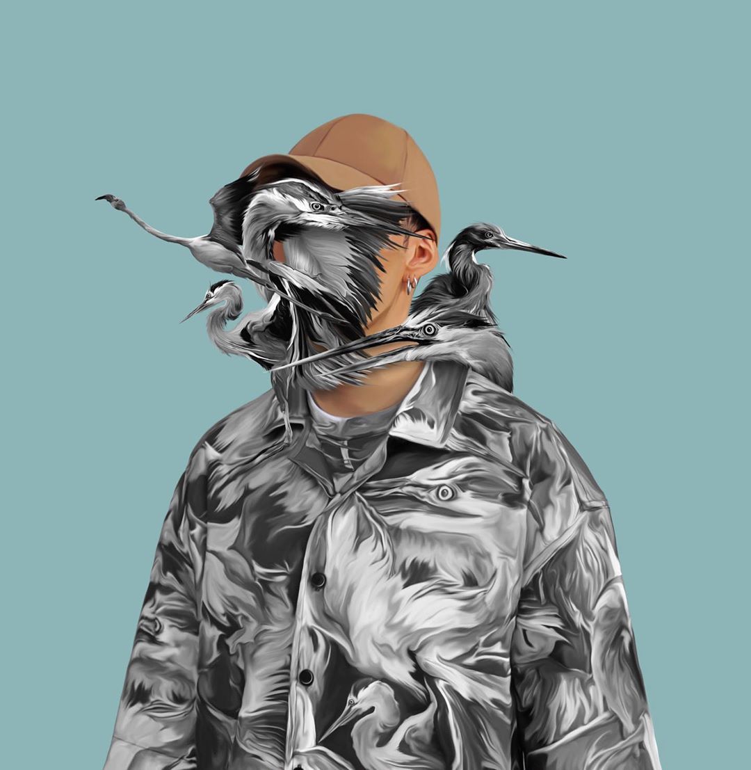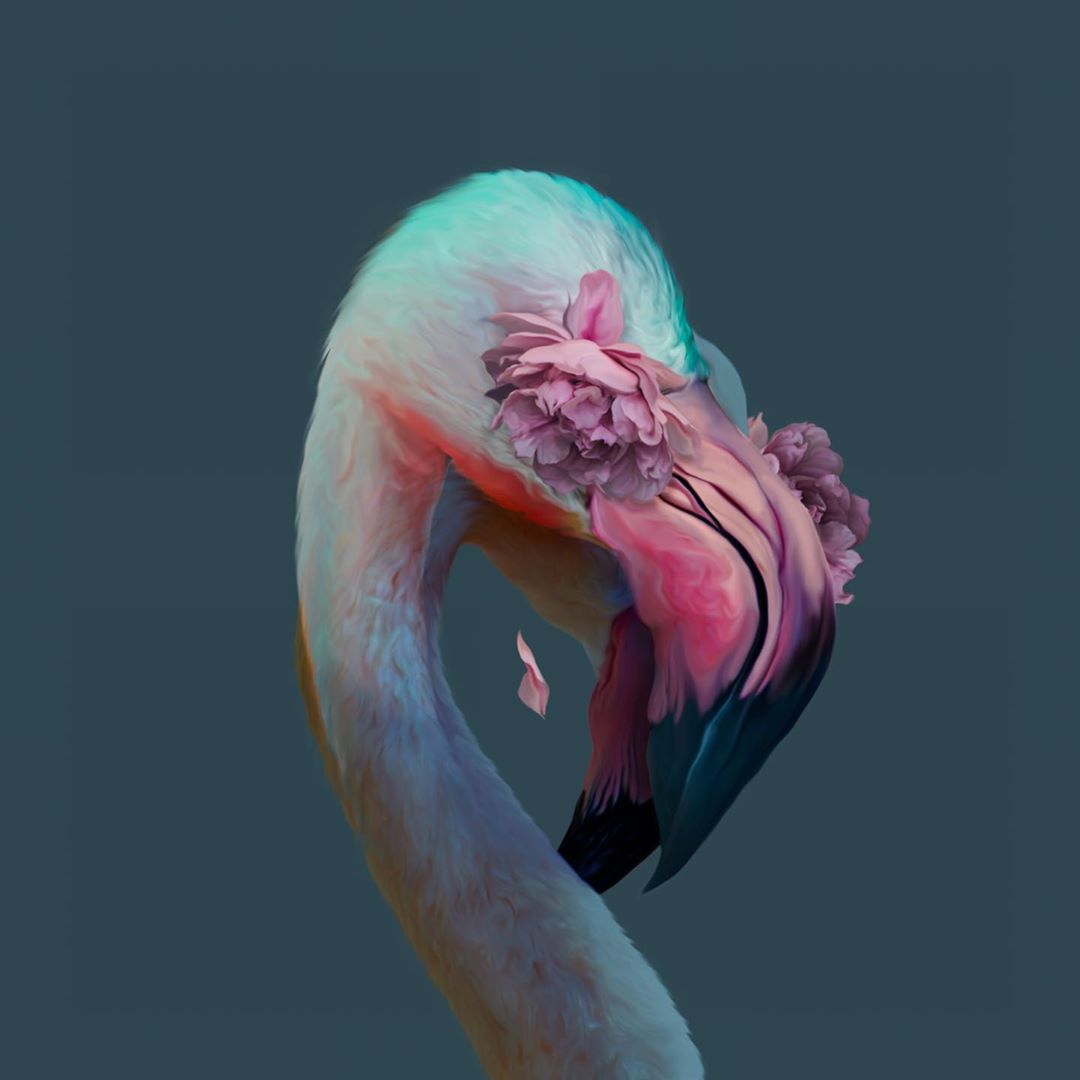 Usa distintas técnicas digitales y collage para crear estas composiciones en las que las flores y las aves tienen un lugar primordial. El estilo que representa la obra de Luévanos se llama maximalismo, que puede definirse como un amor por el exceso, donde “más es más”.