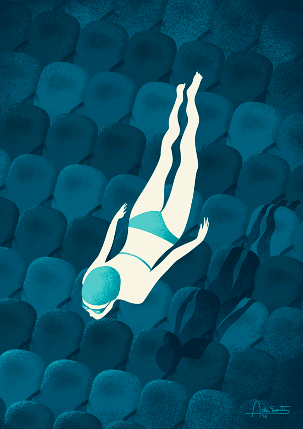 El agua, las piscinas y los libros son una temática recurrente en las ilustraciones del italiano, que contribuyen a crear una atmósfera onírica en todos los proyectos que firma.