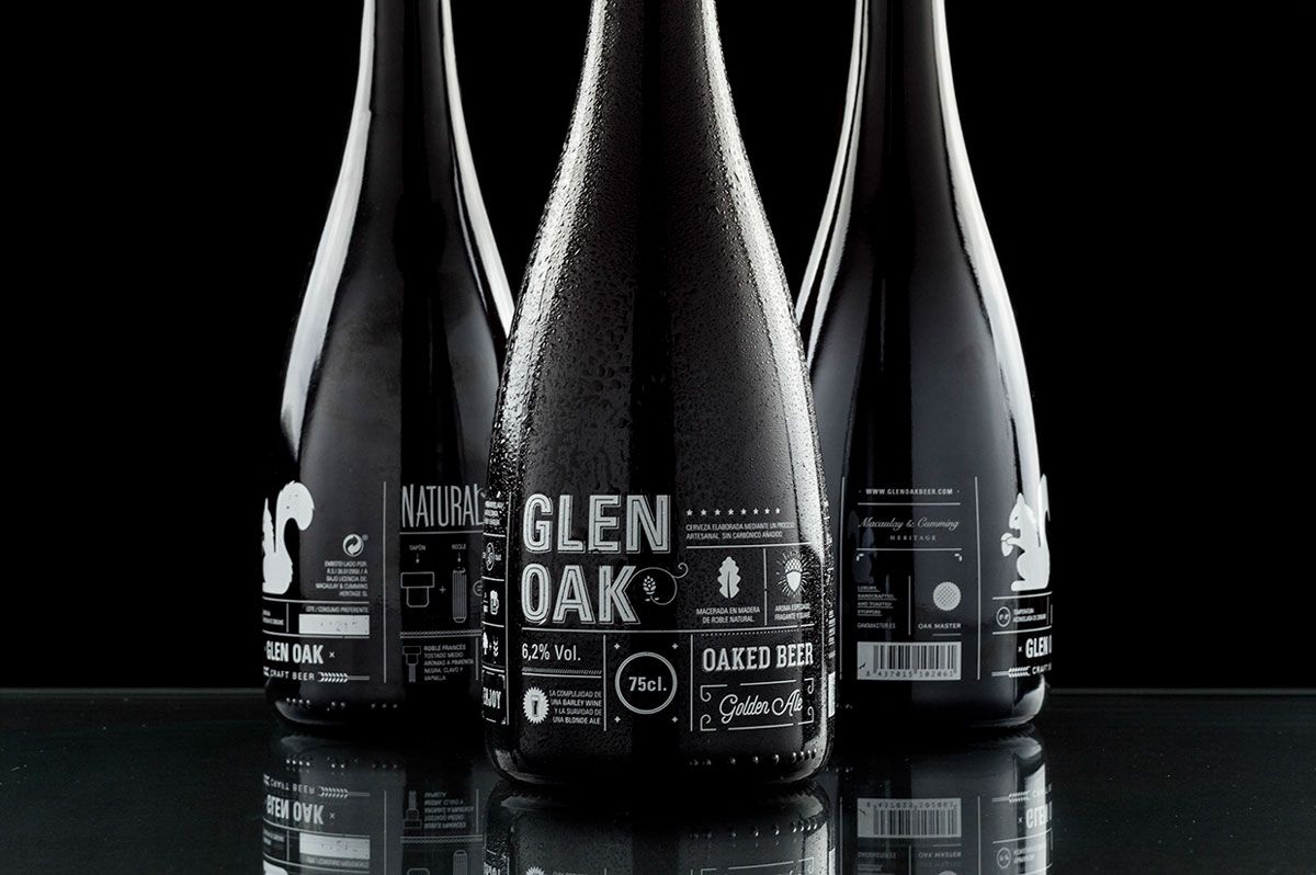 El lettering, diseñado ad hoc para el etiquetado de Glen Oak y su posición en el pie de la botella de 75cl. hacen de este branding un recurso elegante digno de una cerveza artesana y gourmet que destaca por sus ingredientes y notas naturales.