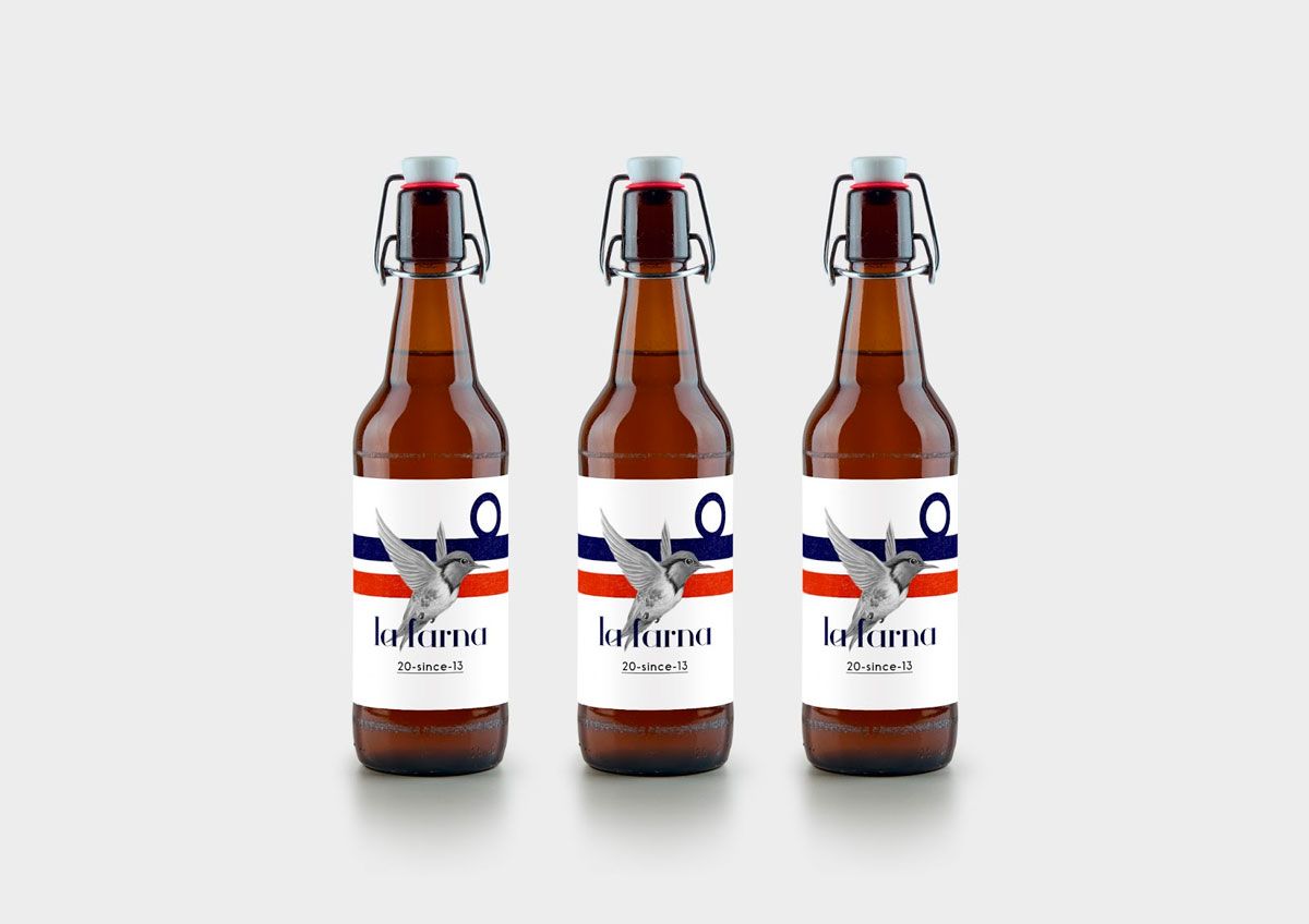 El diseño de Annse Chtaibi para La Farna, una cerveza producida en Sierra de las Villuercas, al sur de la provicincia de Cáceres (España), se centra en la visión del cielo, siempre limpio y lleno de pájaros que lo surcan.