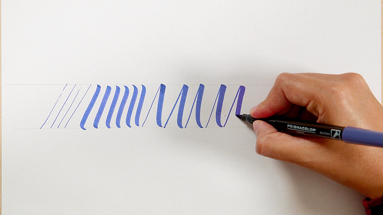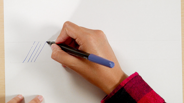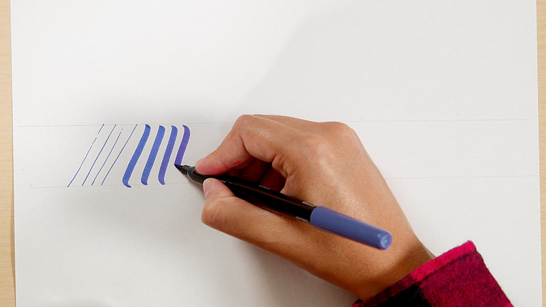 Cuando te hayas familiarizado con los dos tipos de trazo, puedes empezar a conectarlos, sosteniendo siempre el brush pen en un ángulo de 45 grados con respecto a la hoja. Cuanto más sueltes la mano, más fluidas serán tus formas.