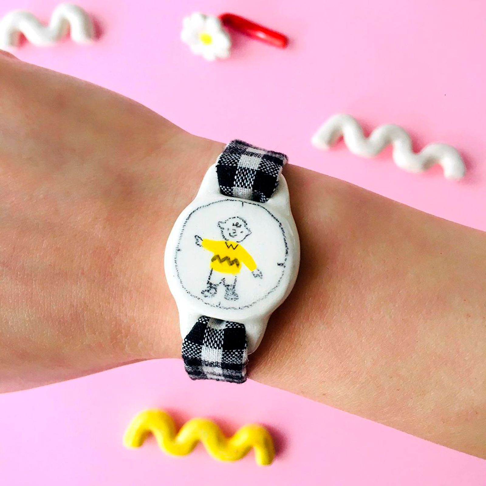 Buena parte de las piezas de cerámica de Milo Hachim son diminutas. Y es que la artista chilena parece encontrarse cómoda trabajando a pequeña escala, con colores brillantes e ideas extravagantes; como este reloj que no marca las horas pero es el complemento perfecto.