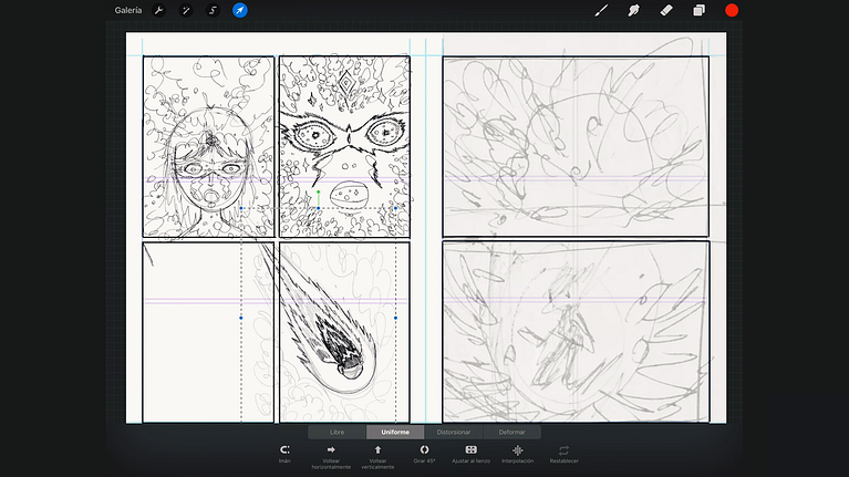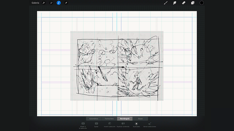 Recuerda que puedes reordenar las viñetas originales de tu boceto sobre papel, combinándolas o creando nuevas para conseguir otros efectos narrativos que te convenzan más. Puedes seleccionar partes concretas del boceto sobre papel y crear capas nuevas con ellas, para moverlas, cambiarlas de tamaño... y, como ya hemos dicho, puedes hacer esto también con todos los bocetos digitales que crees en Procreate.