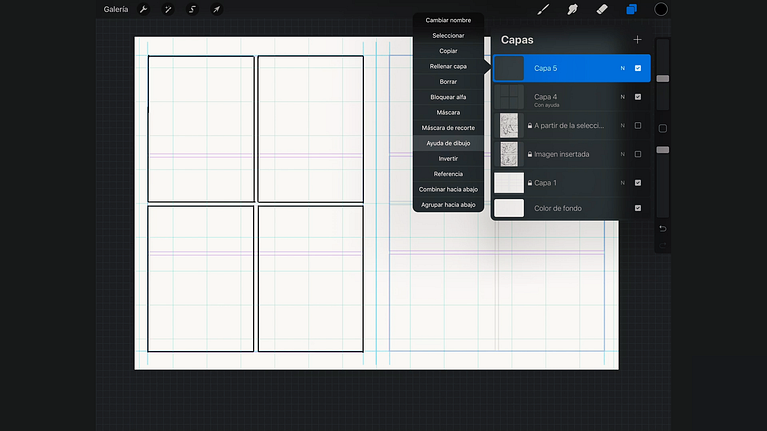 Ahora, crea una nueva capa y, en el menú de Acciones, activa la Guía de dibujo para que aparezca una cuadrícula que te ayudará a la hora de crear tus viñetas. Haciendo clic sobre la nueva capa en el menú Capas, puedes activar la ayuda de dibujo, que te permitirá dibujar líneas completamente rectas aprovechando las guías de la cuadrícula.