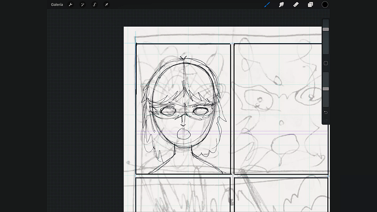 Una vez tengas los marcos dibujados, será hora de ponerse a trabajar en el boceto propiamente dicho, utilizando la herramienta Lápiz de Procreate. Creando una nueva capa, empieza a trabajar sobre el boceto de la página izquierda, planteando dónde van a ir las formas de los personajes y otros objetos de las viñetas. Puedes ajustar tus bocetos digitales a nivel de posición o tamaño; trabajar cada una de las viñetas en una capa distinta te ayudará a tenerlo todo más controlado.