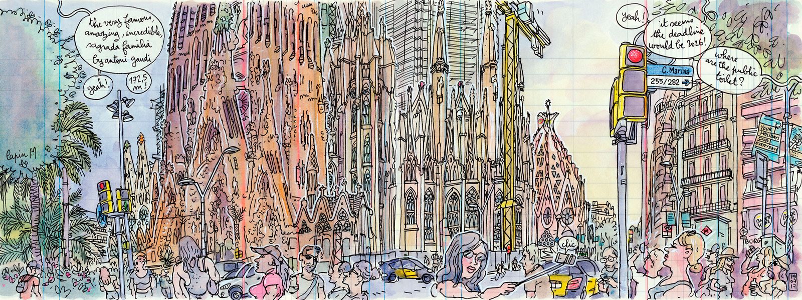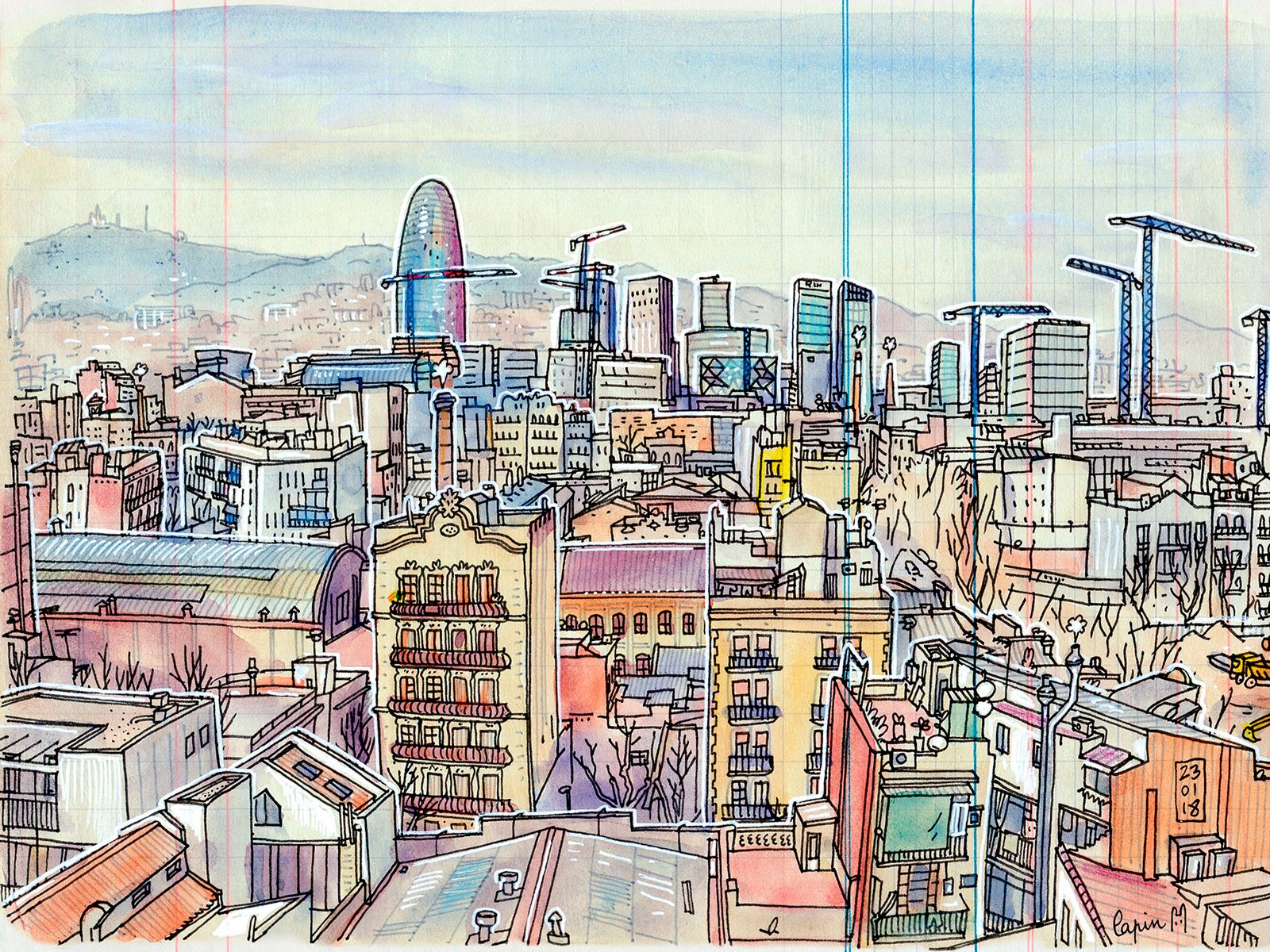 La representación normal de una escena con tres puntos de fuga muestra una visión de 30º, pero el ilustrador Lapin (@lapinbarcelona) trata de abarcar mucho más en sus sketches: 180º e incluso 360º utilizando cada trozo de papel. Para lograr esto, utiliza múltiples puntos de fuga como los que te muestra en esta guía con ejemplos de ilustración urbana.