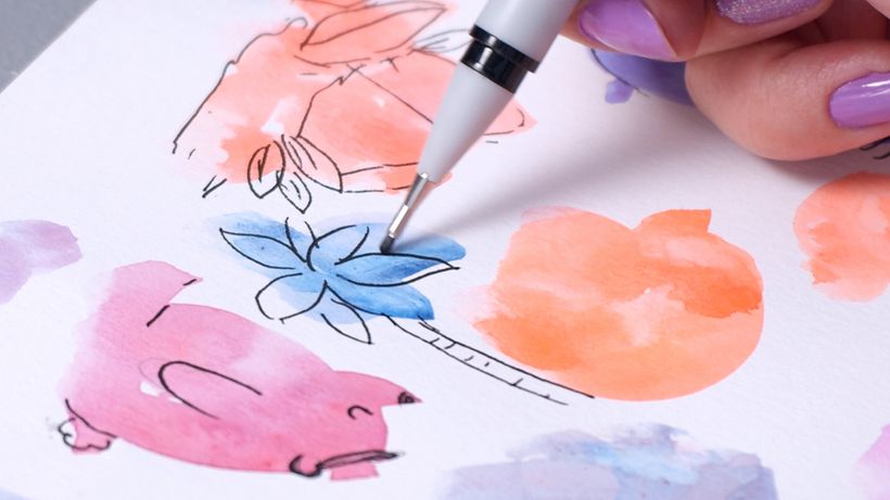 Una vez definidos tus personajes, utiliza un estilógrafo resistente al agua para repasar tus trazos y hacer que destaquen encima de la acuarela. Puedes aprovechar este momento para añadir más elementos si lo necesitas.