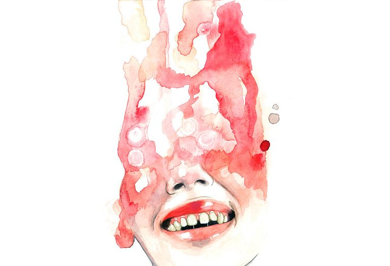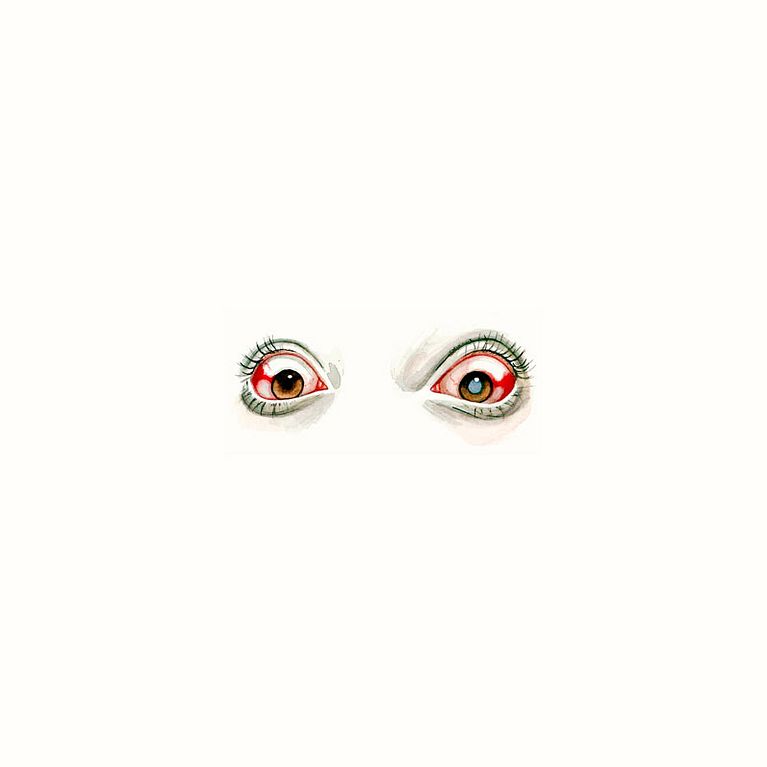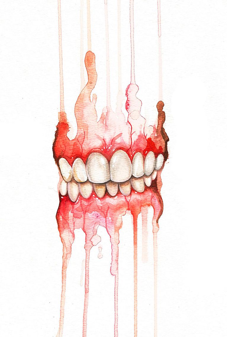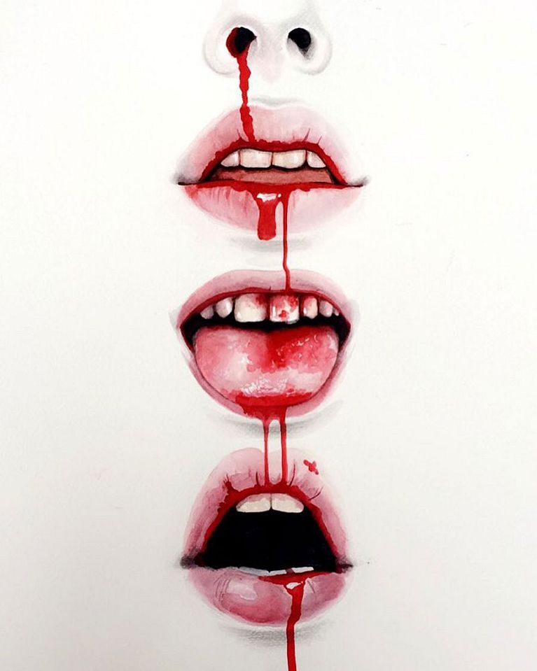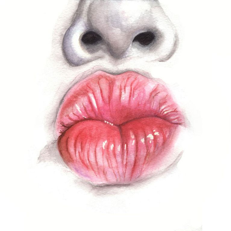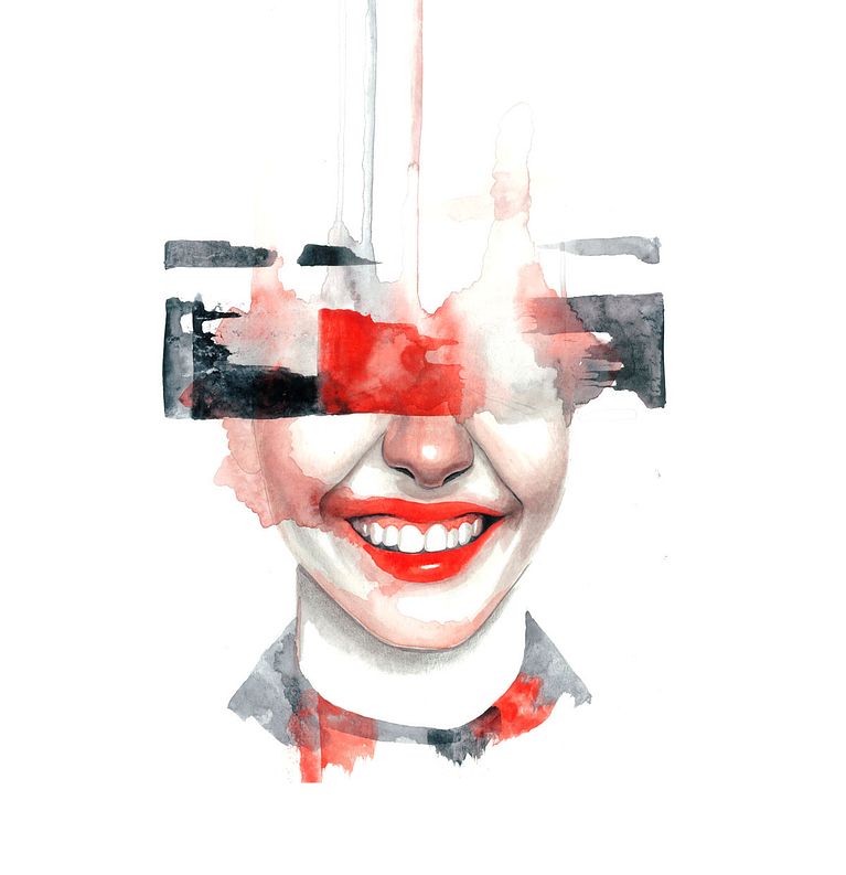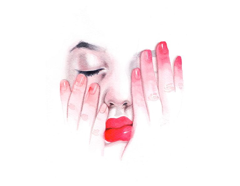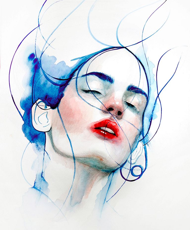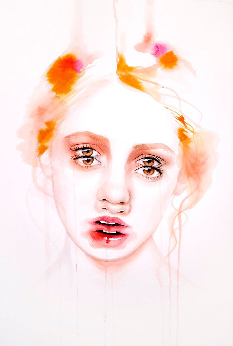 Los ojos y los labios se suceden una y otra vez en sus trabajos, enmarañados entre largas melenas, enmarcados por rostros anónimos o como retales de cuerpos que aparecen en el papel de forma mágica y algo terrorífica. Las acuarelas de Mónica Loya, en parte por el uso que hace del color y en parte por la temática que abordan, se mueven en esa fina línea entre lo maravillosamente bello y cándido y lo tenebroso.