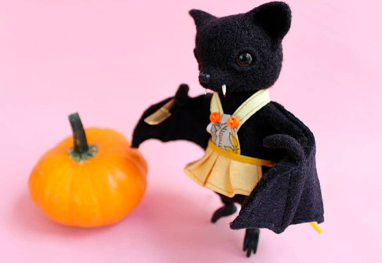 Utilizando vellón de lana y la técnica de needle felting, Caro Indy crea este murciélago de aspecto adorable y colmillos afilados y sangrientos que viste un diminuto delantal. Junto a Murcielaguín, una calabaza en miniatura que nos traslada directamente a Halloween.