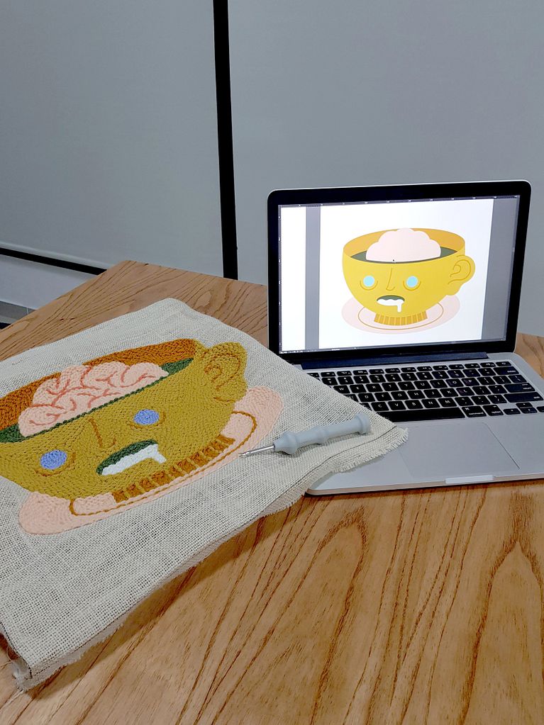 A partir de un diseño digital de lo más escalofriante, Caro Bello ha dado vida a este bordado utilizando una aguja kantan y una paleta de colores básica. No necesita más para provocarnos escalofríos.