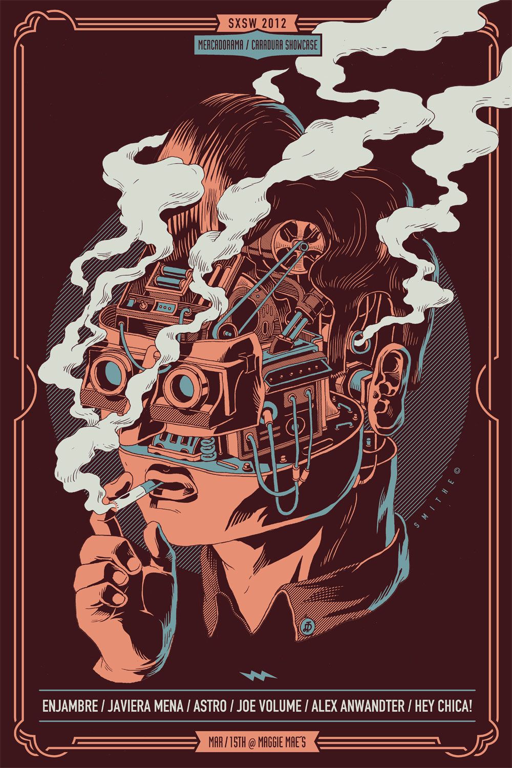Smithe es una de las mitades de Copete Cohete, el estudio gráfico especializado en ilustración que comparte con Pogo, otro gran talento mexicano y con el que también imparte el curso de Diseño de Merchandising para Músicos. Juntos han trabajado para marcas y bandas como Nike, Corona, Converse, Soundgarden, Queens of the Stone Age, Tame Impala o Phoenix.